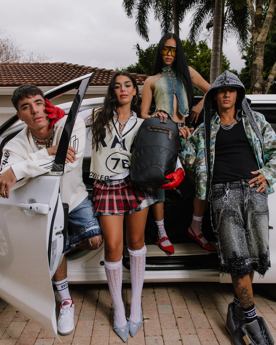 PVC bag with embossed details such as the sharkmouth, zipper pullers, and ID tag. Sewn faux leather details around the front zipper pocket and ID tag.