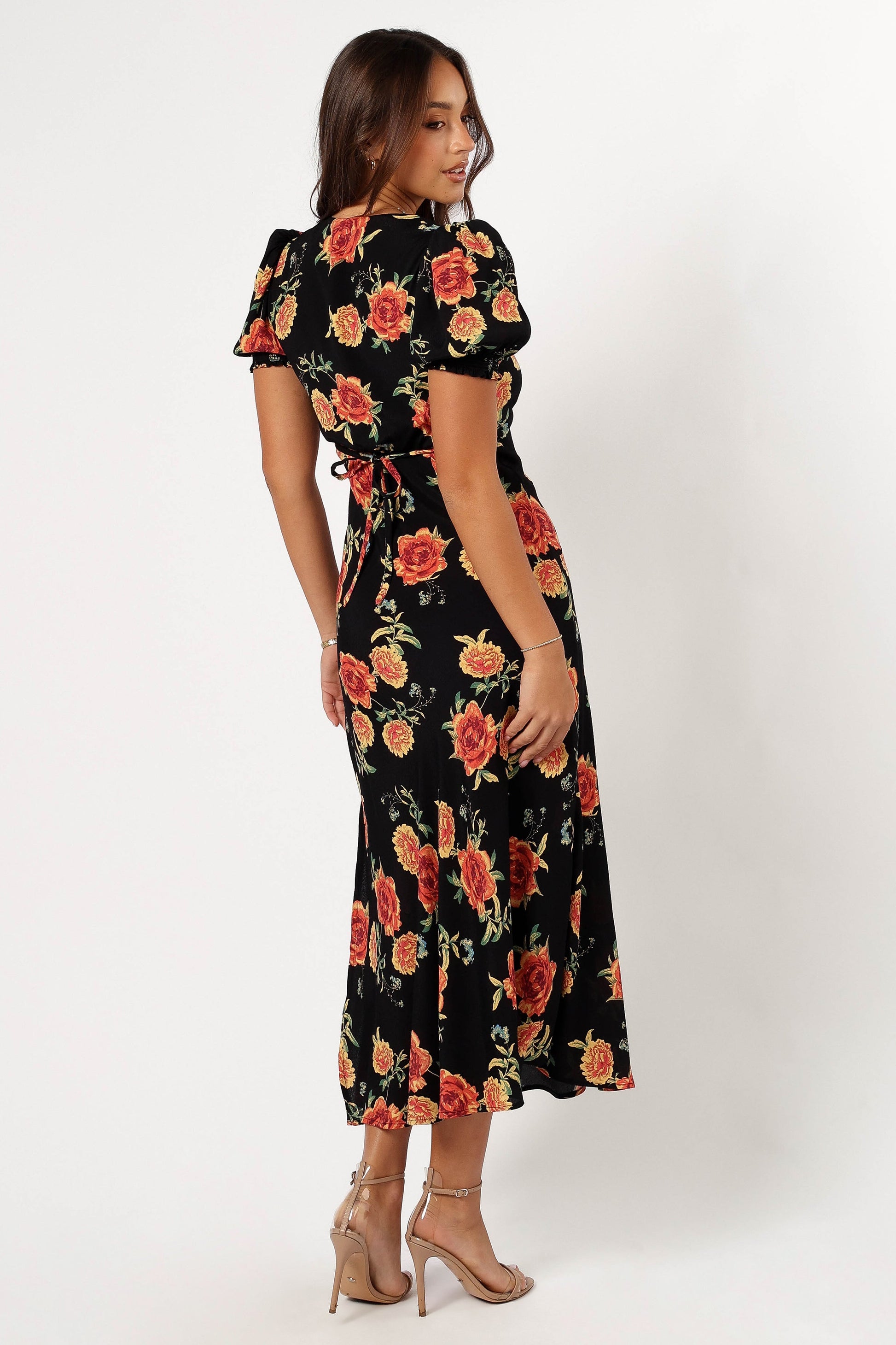 DETAILS This midi dress is a timeless classic with its short sleeves and v neckline. The back tie detail at waist ensures an elegant silhouette, while the front split gives you a bit of extra movement for maximum comfort.