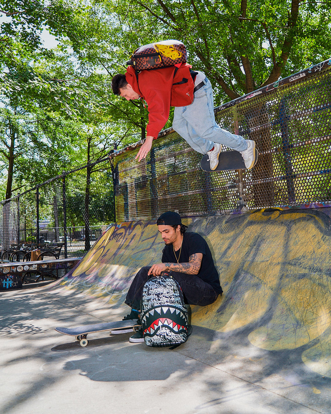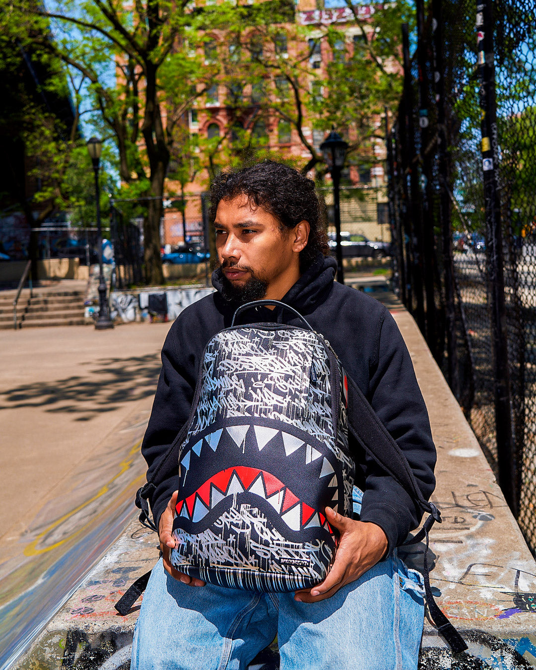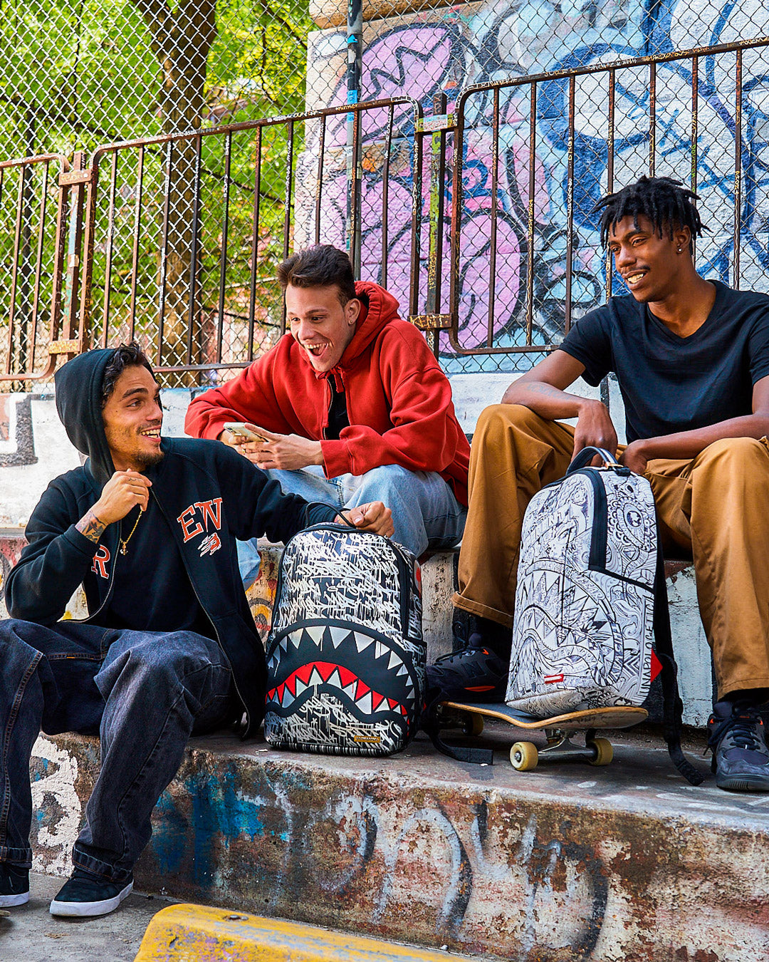 Dimensions: 18' x 6' x 11.5' • Front zipper pocket • Side pockets • Zippered Stash pocket • Separate velour sunglass compartment • Ergonomic mesh back padding • Adjustable Straps for custom sizing • Gold zippers with metal hardware • Metal 'Sprayground Authentic' badge • Slide through back sleeve connects to carry-on luggage to free your hands