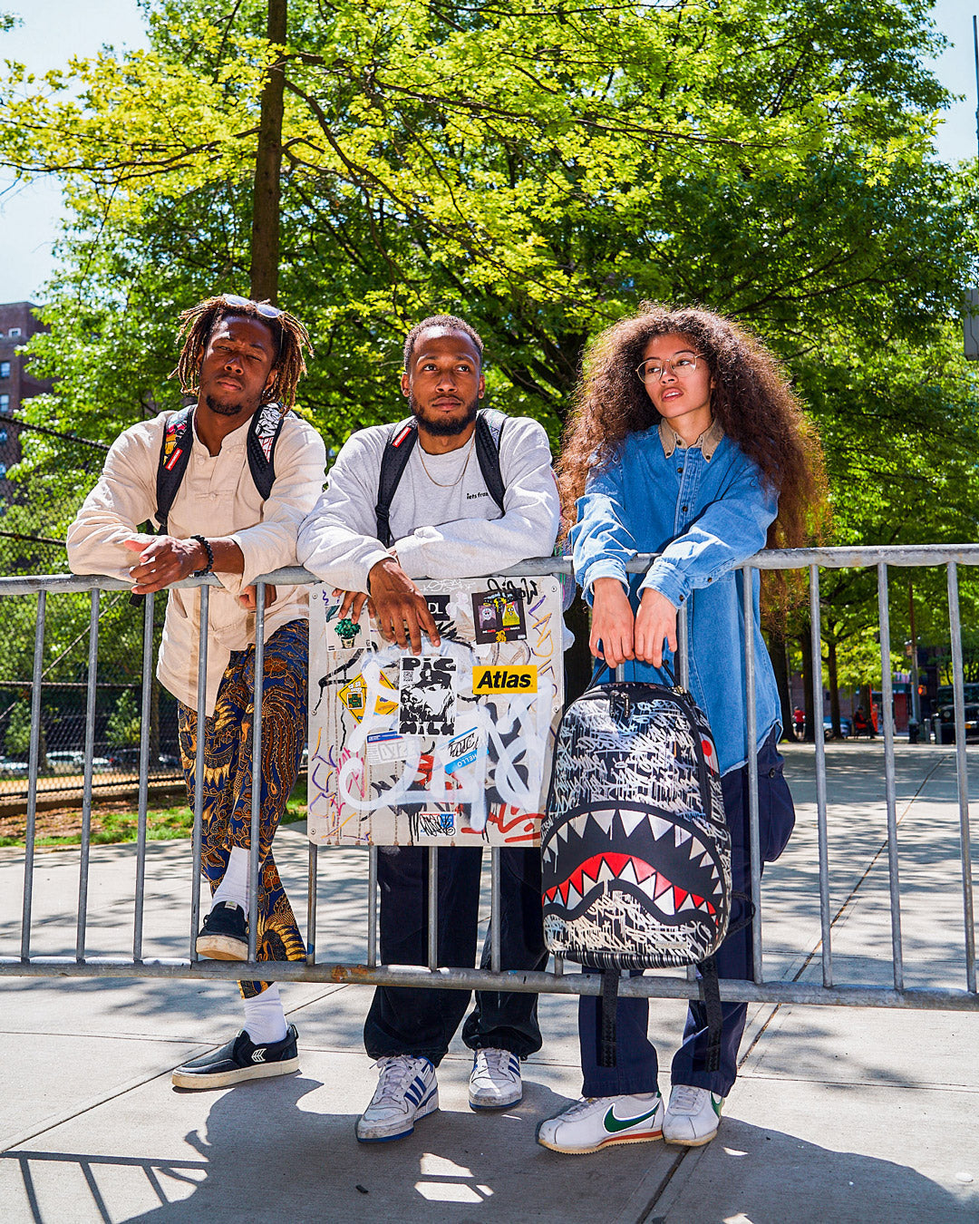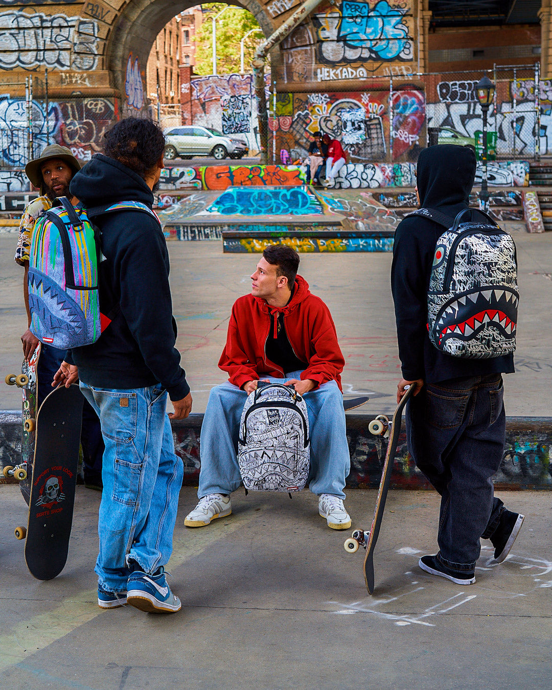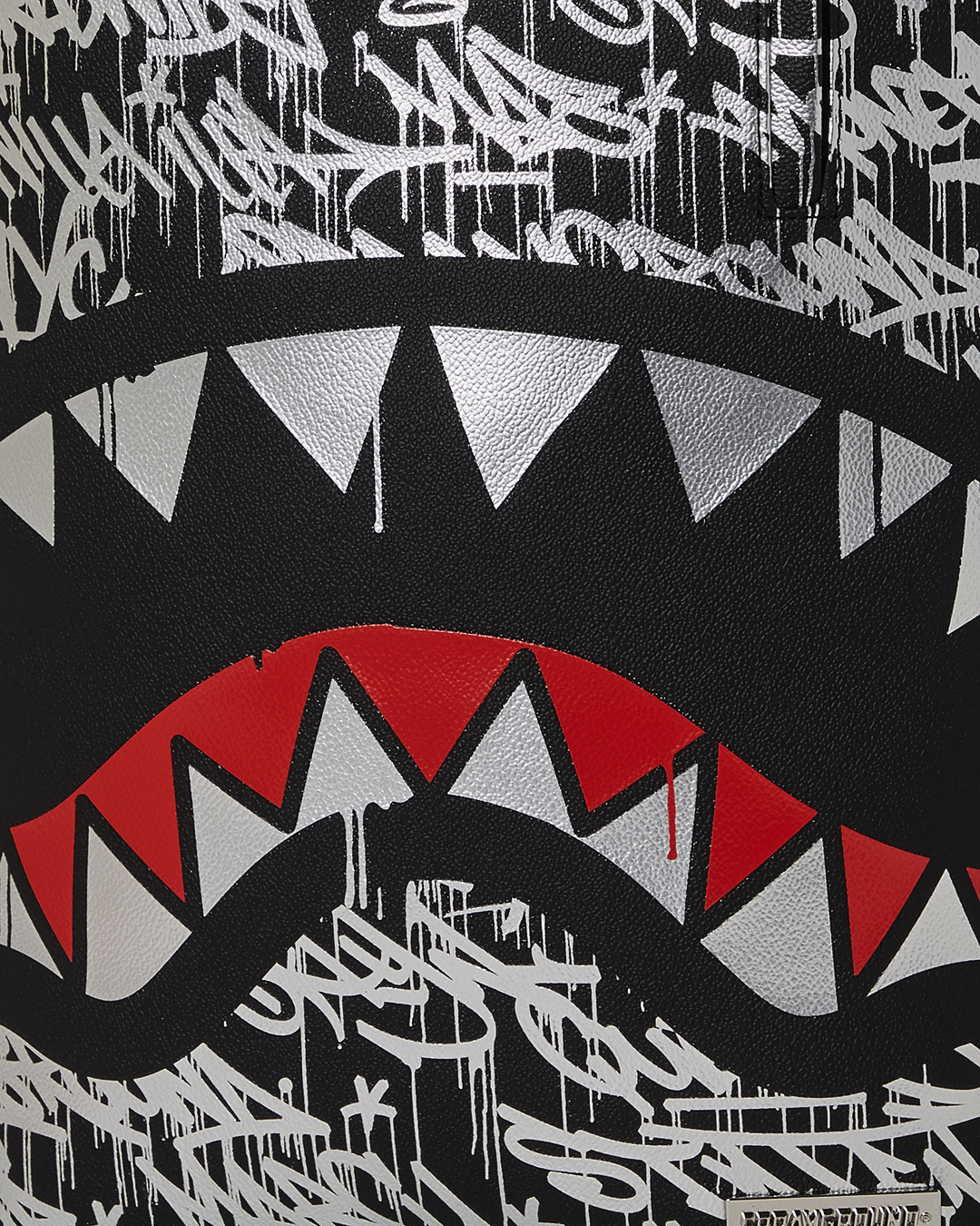 Dimensions: 18' x 6' x 11.5' • Front zipper pocket • Side pockets • Zippered Stash pocket • Separate velour sunglass compartment • Ergonomic mesh back padding • Adjustable Straps for custom sizing • Gold zippers with metal hardware • Metal 'Sprayground Authentic' badge • Slide through back sleeve connects to carry-on luggage to free your hands