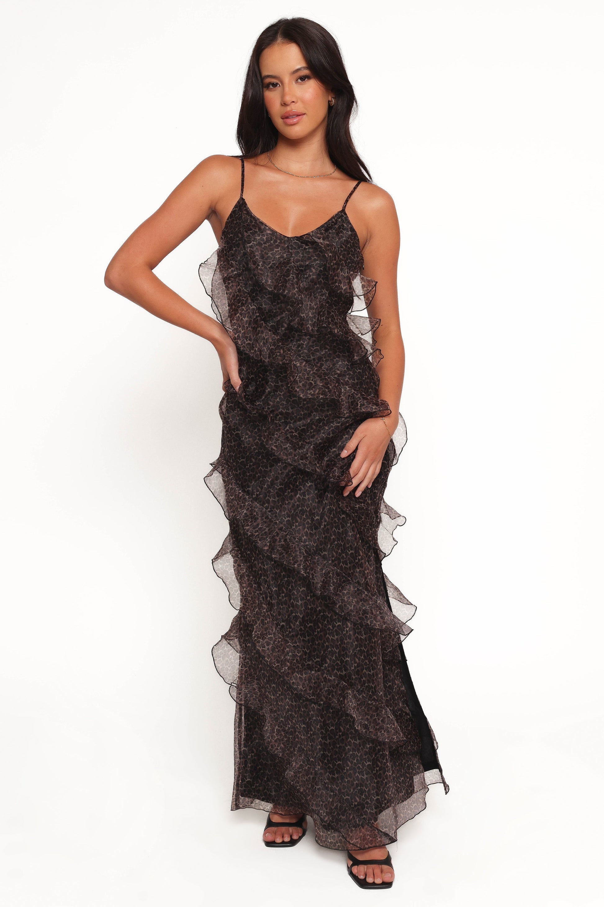 | DETAILS Step into the spotlight with the Ciao Ruffles Maxi Dress in Black Leopard. This eye-catching piece combines elegance and playfulness, making it the perfect addition to any wardrobe. The maxi length and v neckline create a silhouette that's both sophisticated and effortlessly chic, while the thin adjustable straps and invisible side zip ensure a tailored fit that flatters your figure.