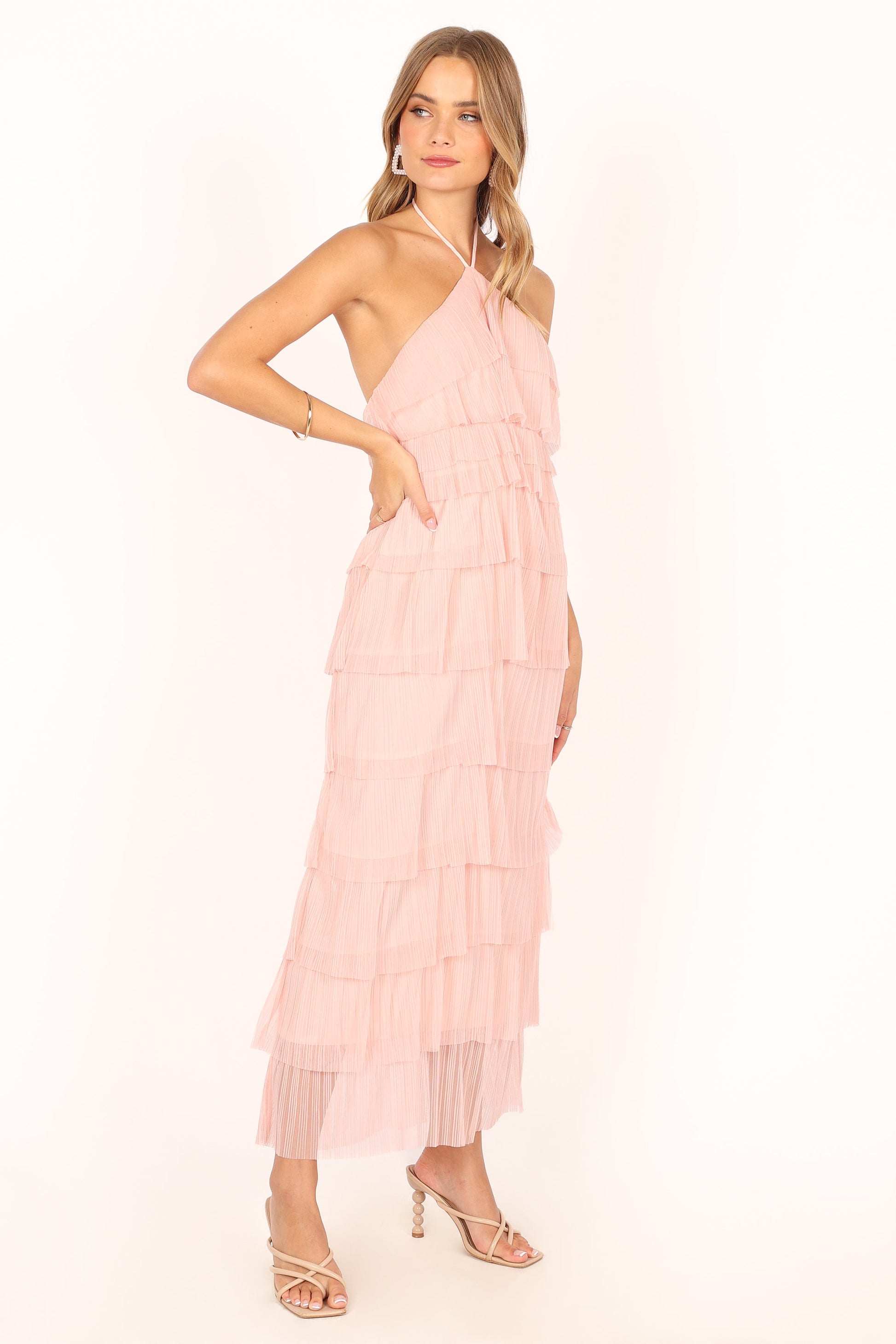 DETAILS This pink maxi dress is the perfect pick for a special event. With its halter neckline and tie close, it's both stylish and comfortable. The invisible side zip with hook and eye clasp allows you to get in and out easily, while the side split creates movement as you walk.