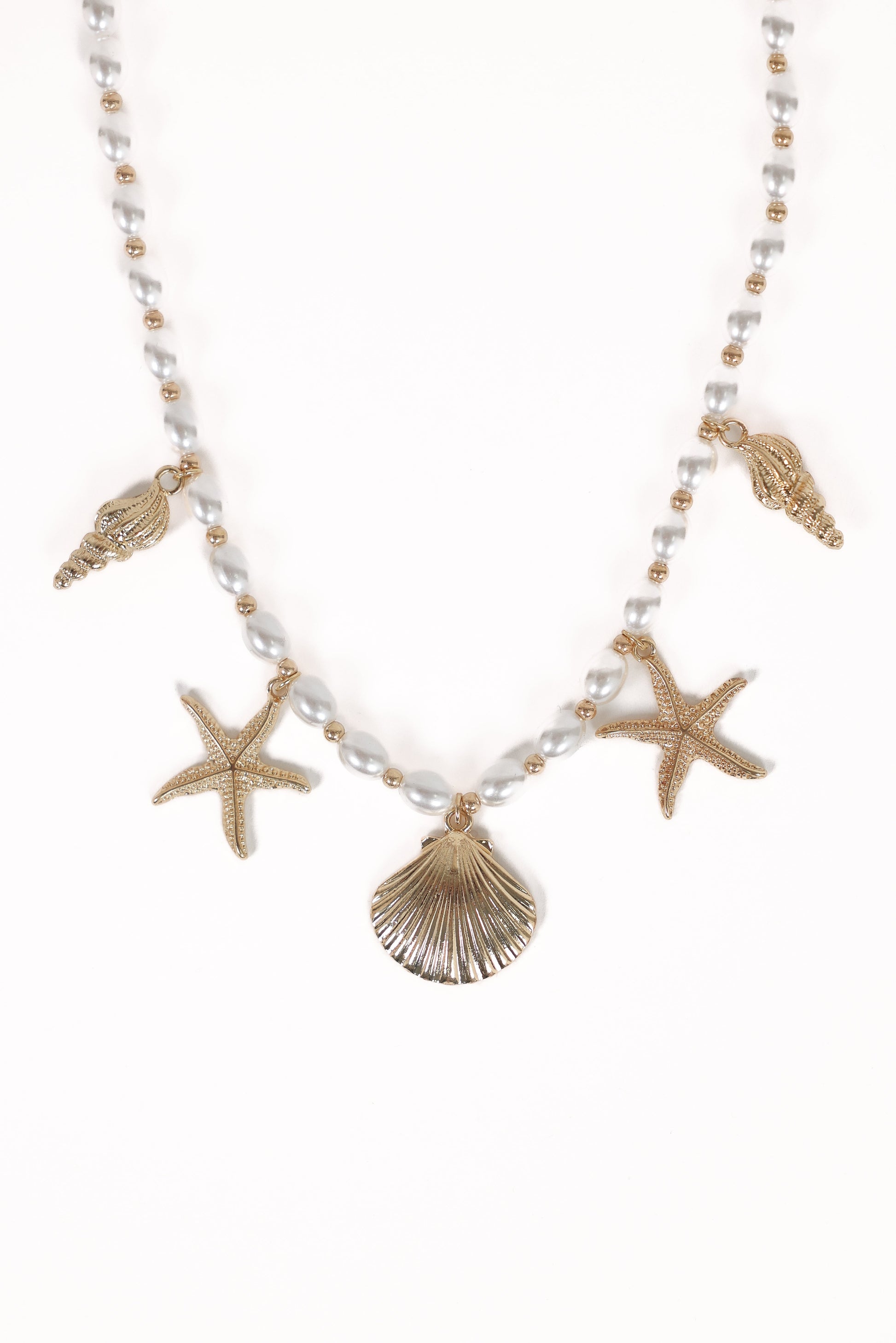 DETAILS Elevate your jewelry game with the Costa Necklace - Pearl, the perfect blend of coastal charm and timeless elegance. Featuring a delicate string of faux pearls paired with seaside-inspired pendants, this piece instantly transports you to sunlit shores and ocean breezes.