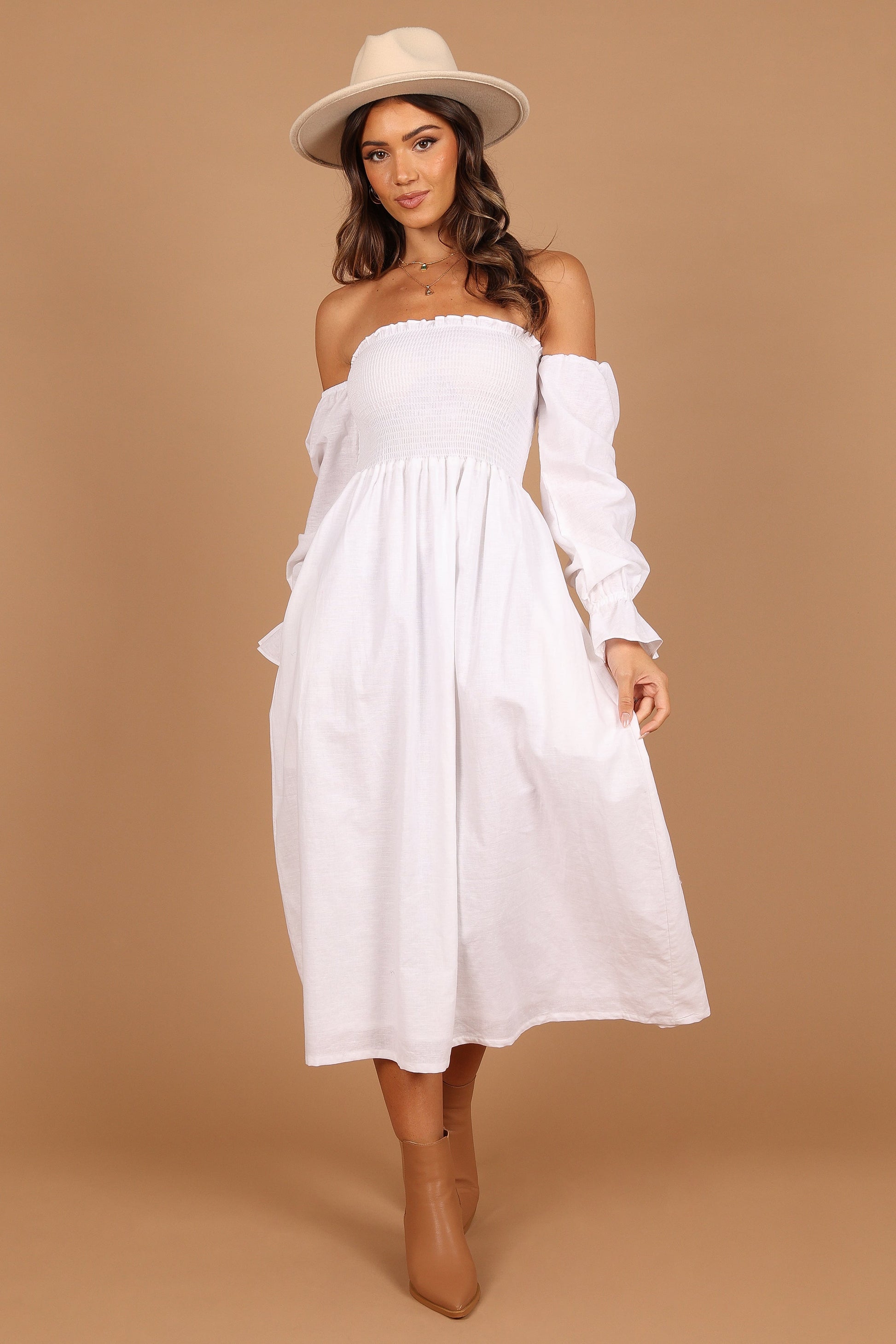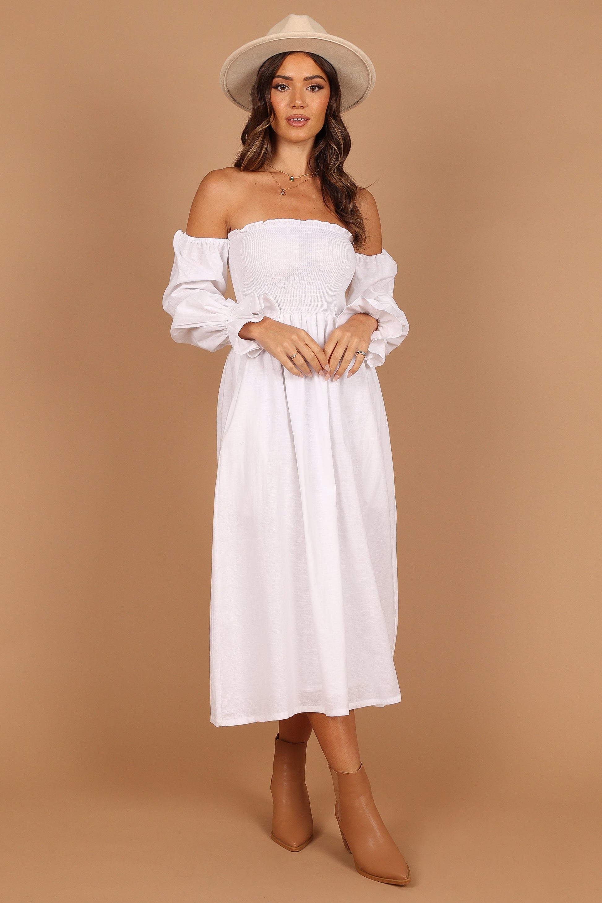 DETAILS This off shoulder midi dress is an easy-to-wear piece that will keep you feeling feminine and elegant. The long sleeves feature elasticised shoulders, complete with a ruffle cuff for added charm. The shirred bodice ensures a comfortable fit, while the functional pockets provide extra convenience.