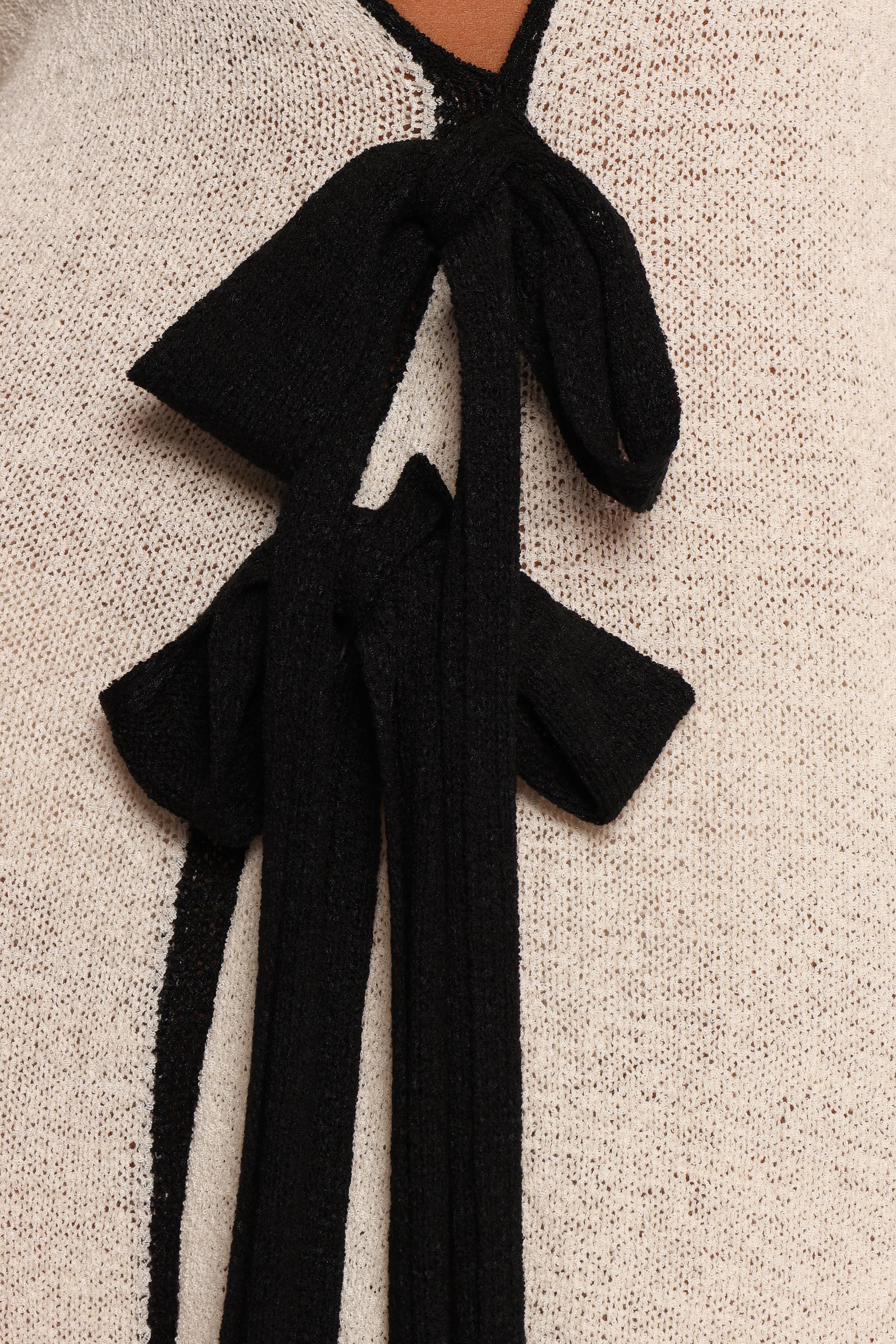 DETAILS Designed with a flattering midi length and a sophisticated v-neckline, this dress is the perfect blend of chic and modern style. A removable black crop cami with thin adjustable straps allows for a customised fit and layered versatility, while the decorative bow detail adds a touch of charm.