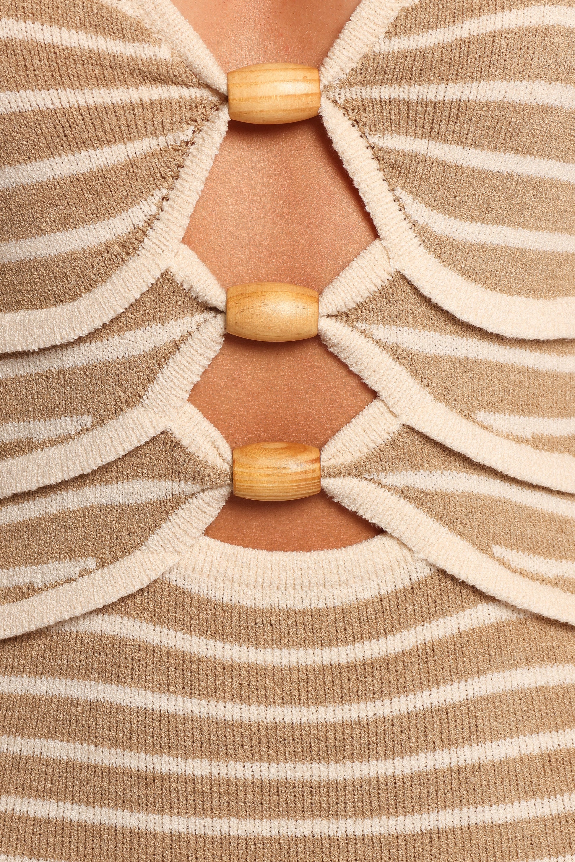 DETAILS Step into effortless style with the Farrah Midi Dress in Light Taupe. This fashion-forward piece combines sophistication with a touch of edge, thanks to its sleek midi length and sleeveless design. Designed with a soft brown stripe pattern and a bodycon fit, this dress brings just the right balance of comfort and contour.