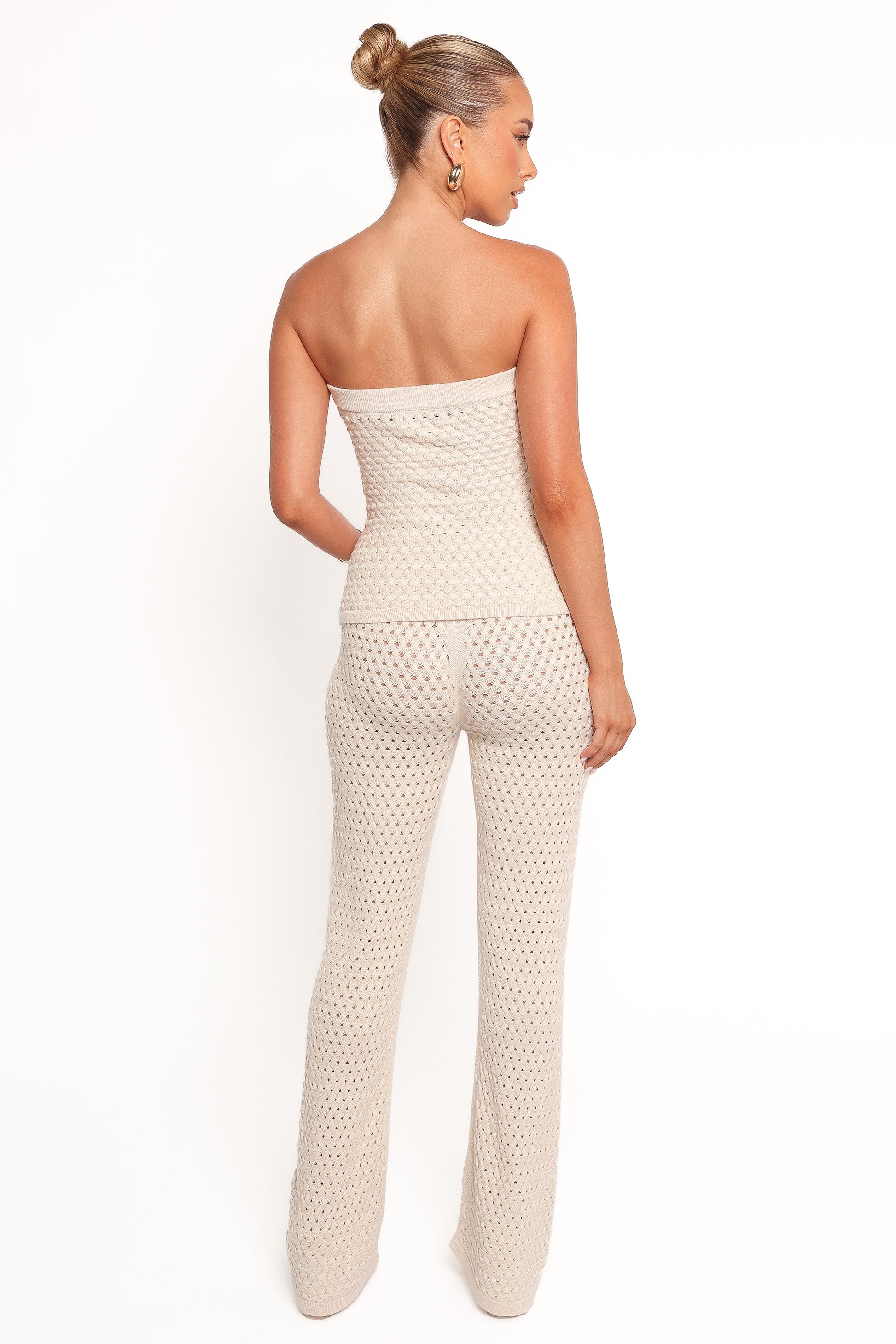 DETAILS Effortlessly chic and endlessly versatile, the Fonte Pants in cream are your summer wardrobe's ultimate staple. Crafted from a breathable summer knit with a crochet-inspired pattern, these high-waisted beauties are designed for both style and comfort.