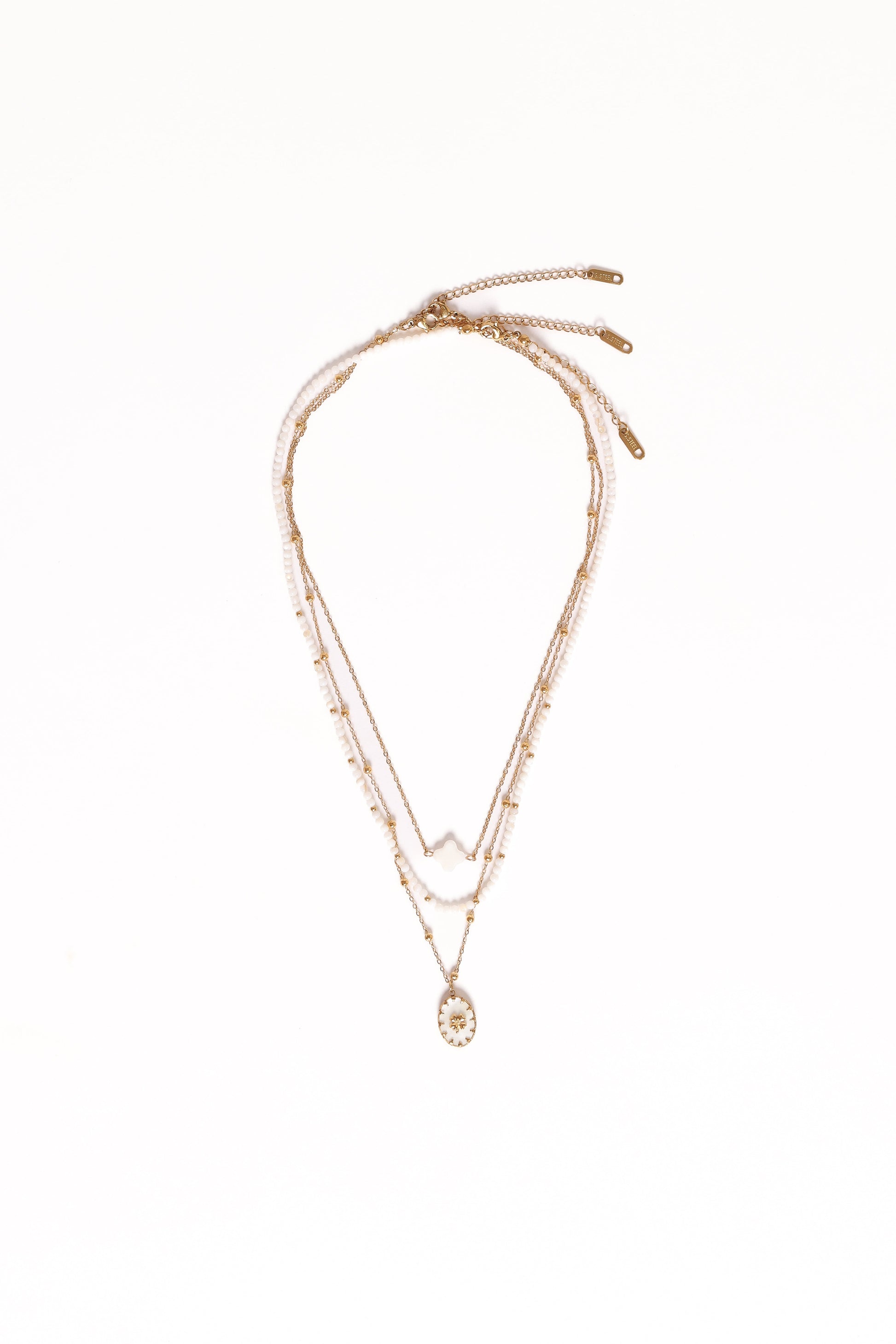 DETAILS Elevate your accessories game with the Goldie Necklace in Gold/White, a stunning trio of layered perfection. Featuring fine chain styles adorned with delicate white bead details and chic shell pendants, this set offers a contemporary beach-inspired vibe that's versatile enough for every occasion.