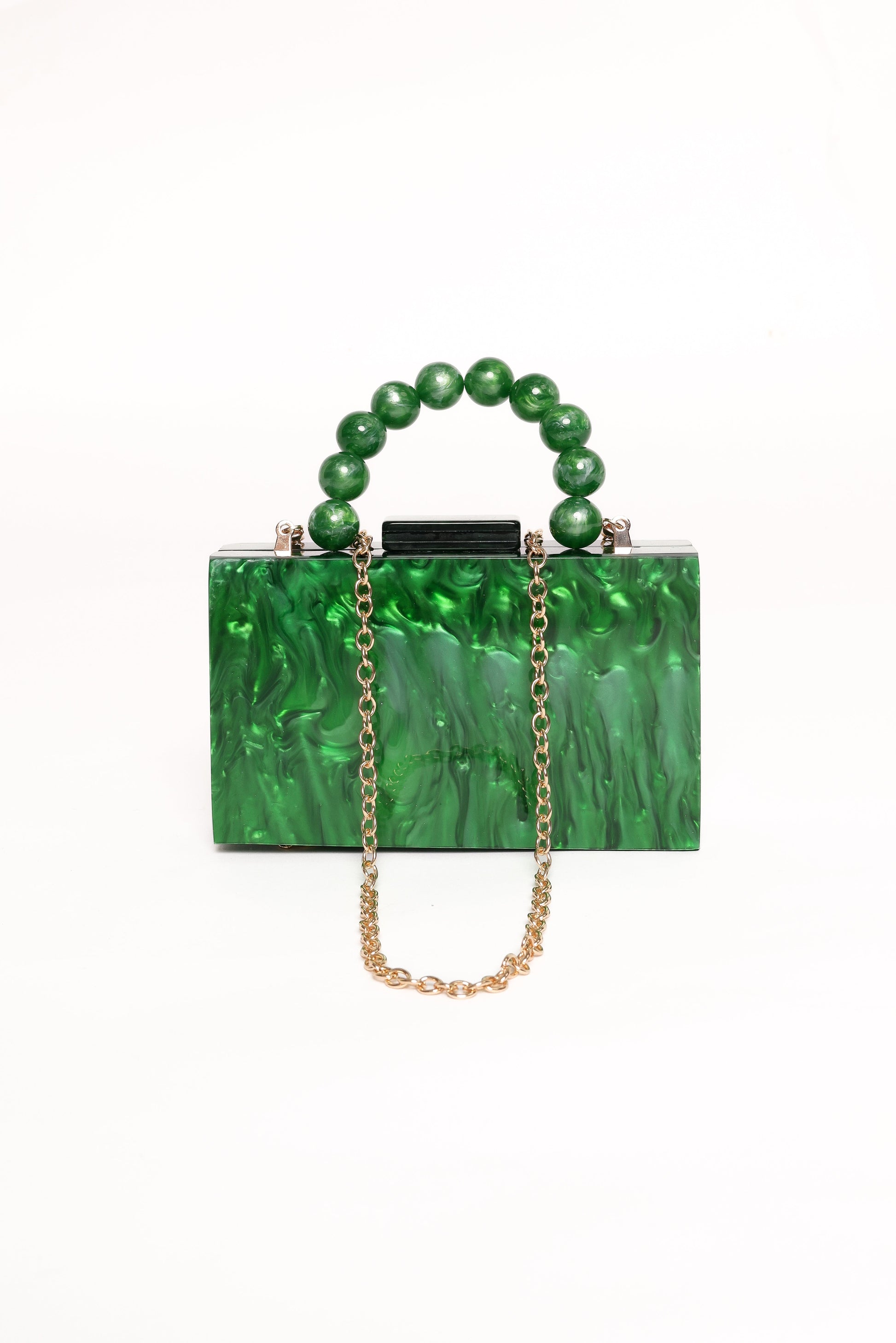 | DETAILS Introducing the Greta Bag in Emerald Green—a statement piece that effortlessly elevates any outfit. Its striking rectangular design and luxurious marble green hue make it a must-have for the fashion-forward individual. The beaded top handle adds a touch of elegance, while the magnetic closure ensures your essentials are secure yet easily accessible.