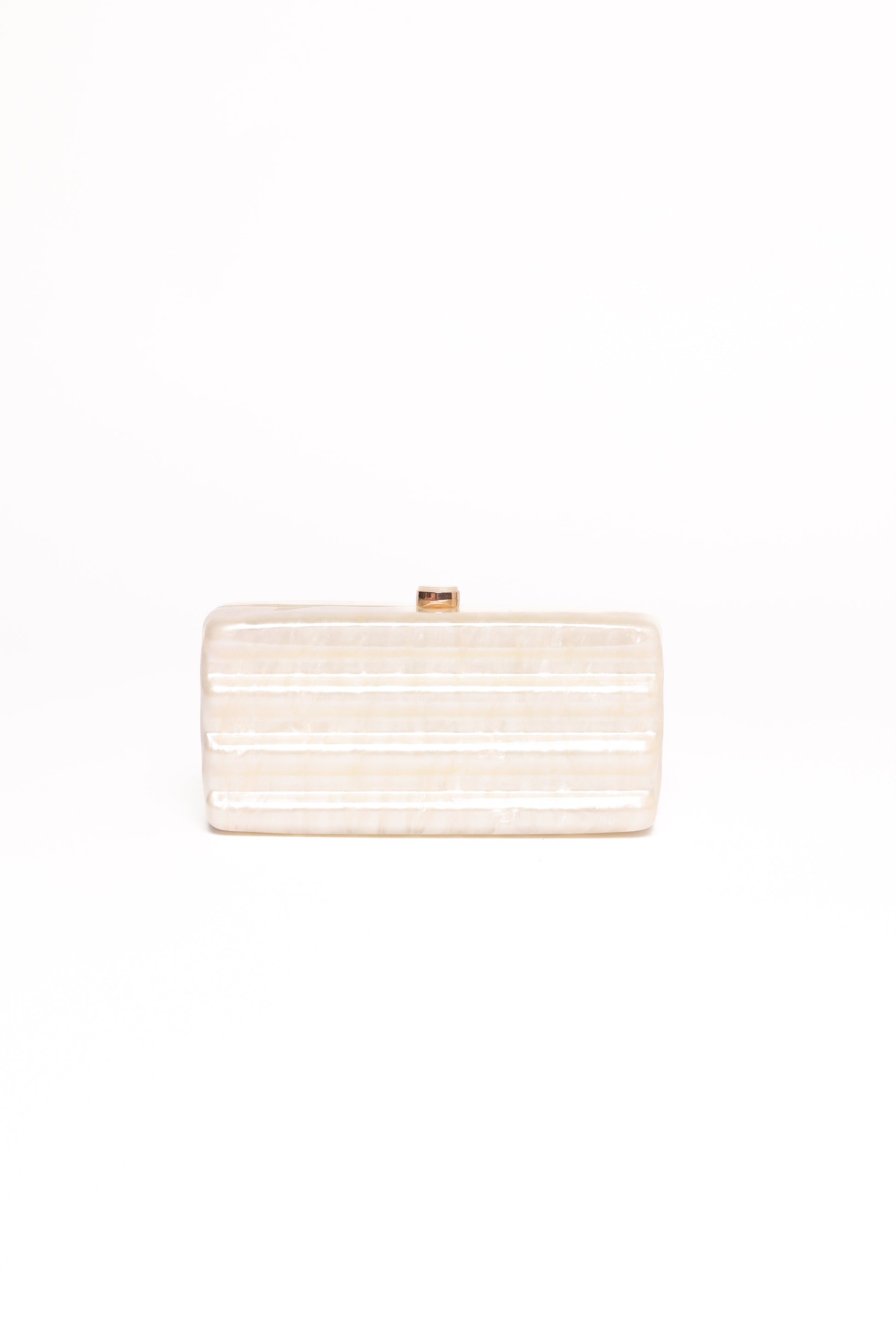 DETAILS Elevate your evening look with the Helena Clutch in Pearl, where timeless elegance meets modern design. Crafted with a lustrous pearl resin case that catches the light effortlessly, this statement piece is perfect for any occasion that calls for a touch of sophistication.