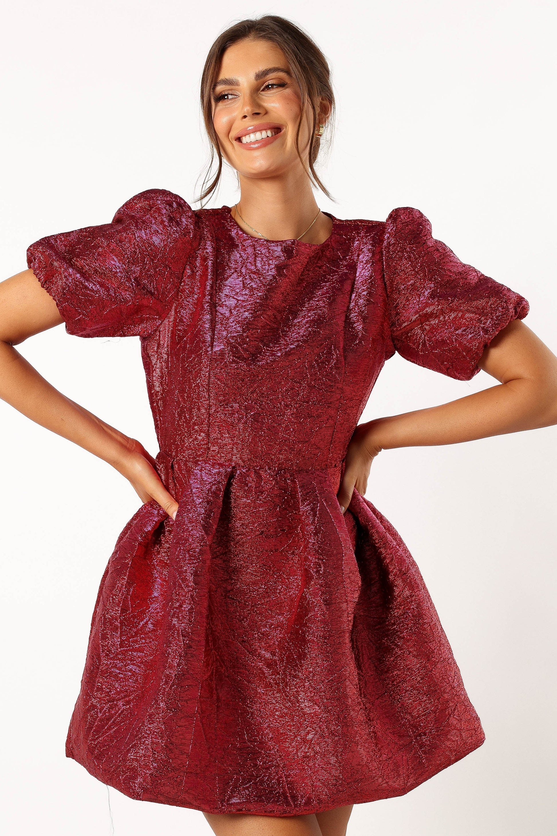 DETAILS This dress is the perfect way to show off your playful and trendy style this fall. This mini length dress features an high round neckline with button close, short sleeves with elasticised cuffs, as well as a heart shape cut out with half length back zip for easy wearability.