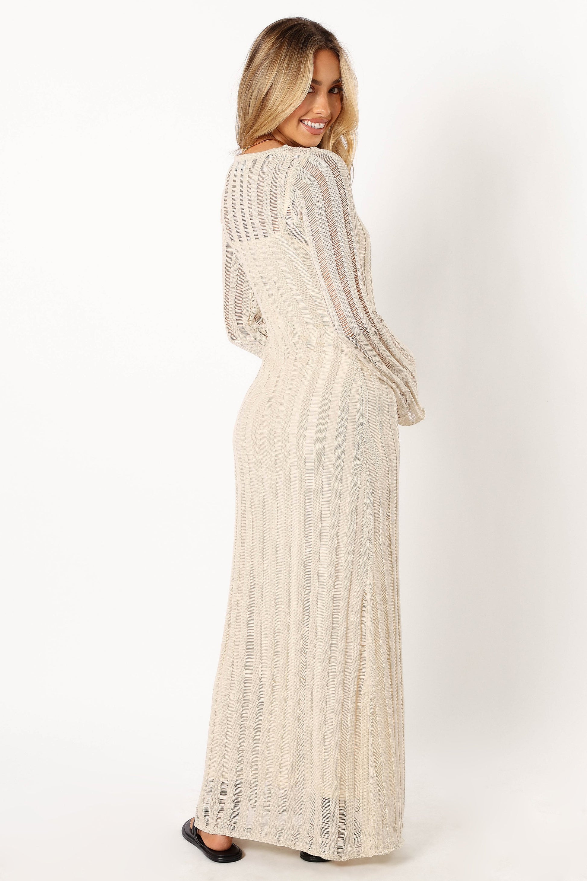 DETAILS The midi length and round neckline of this beautiful dress make it the perfect pick for your next vacation. The long sleeves feature a fine delicate crochet design, making it the ideal way to add a touch of elegance to any look.