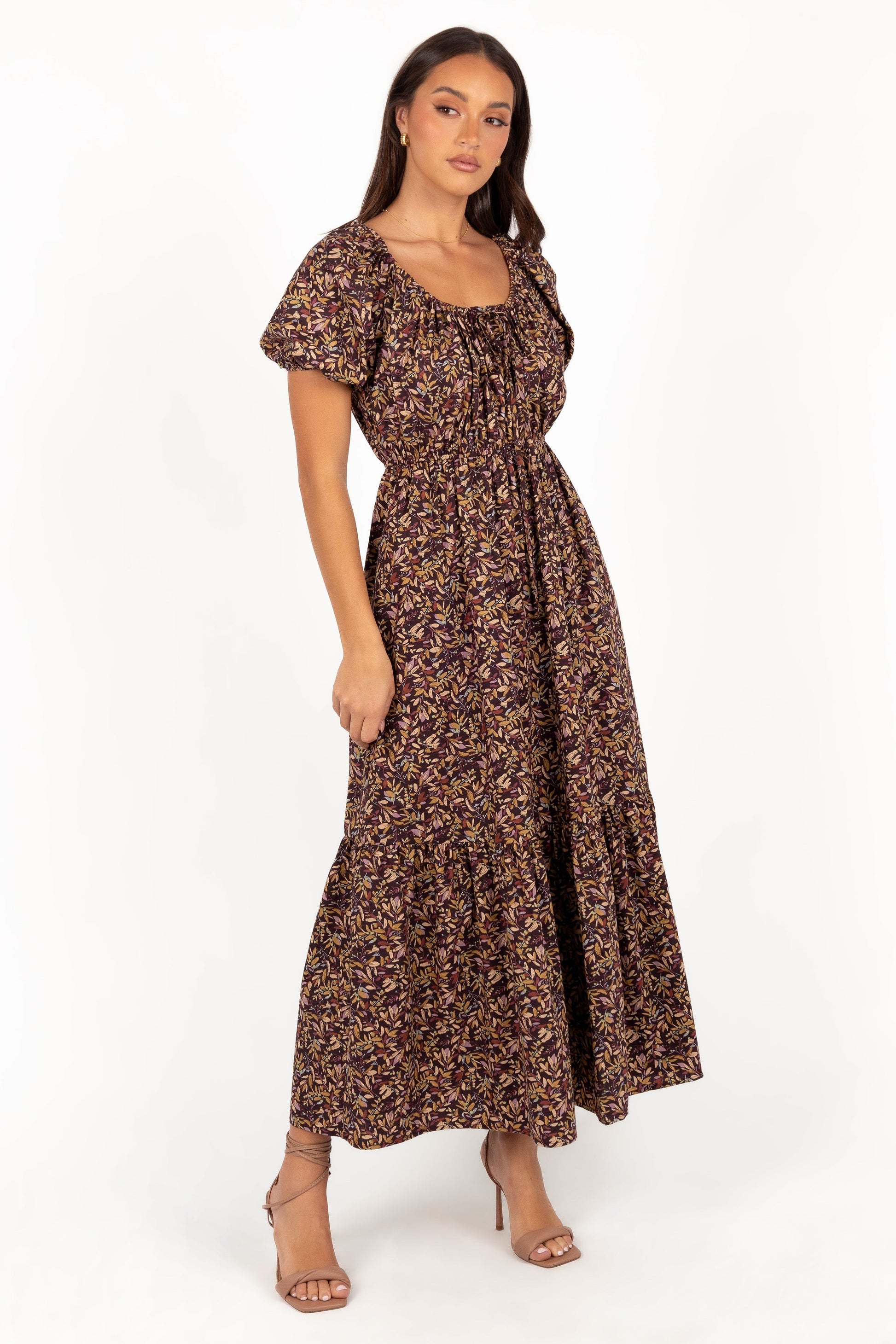 DETAILS This stunning dress, with its serene plum floral pattern, is designed to make you feel both comfortable and chic, no matter the occasion. The round neckline and short sleeves with elasticised cuffs provide just the right amount of coverage while keeping you cool and comfortable.