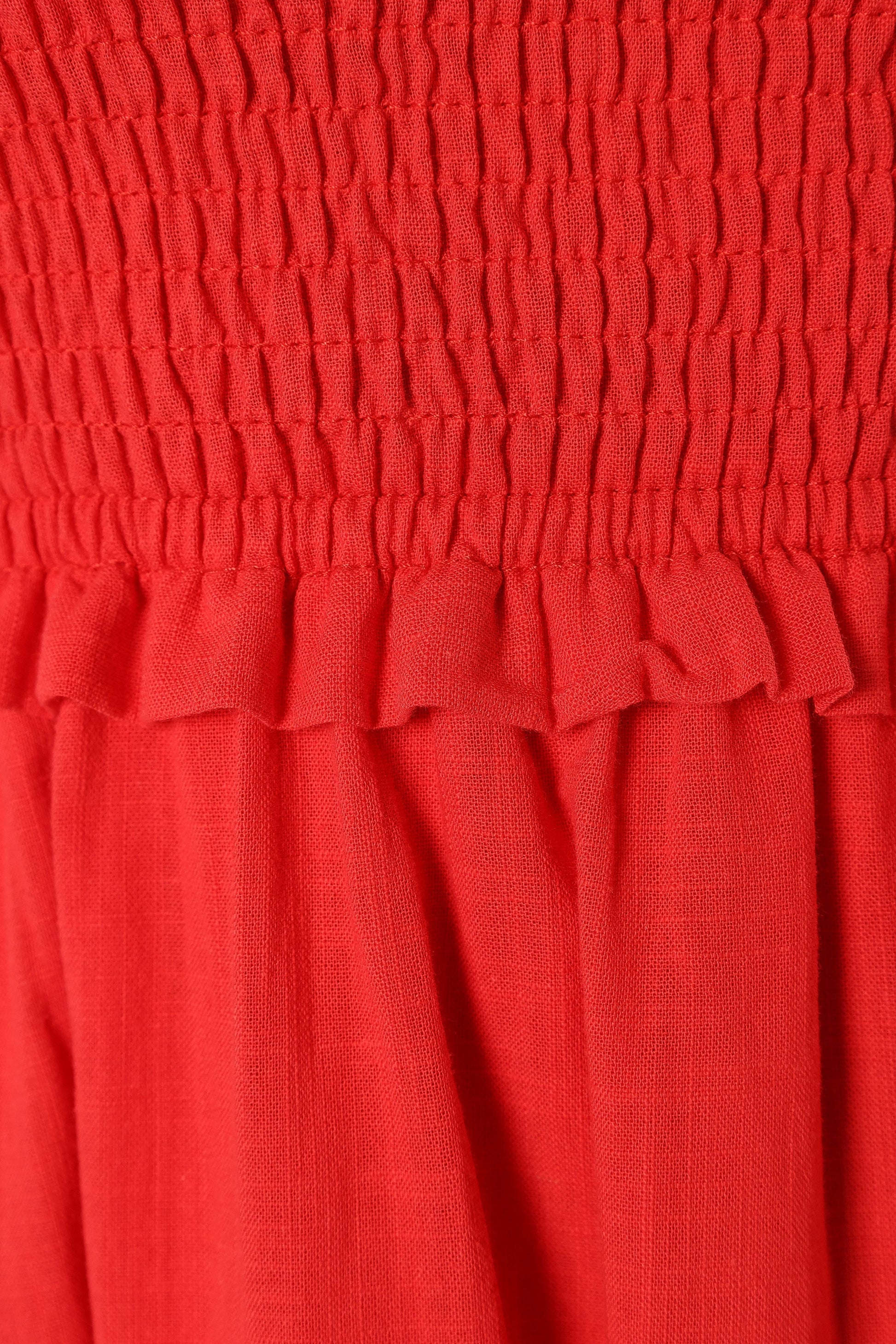 | DETAILS This midi length dress is all you need to turn heads this season. Cut in a strapless design with a straight neckline, this fun number comes complete with shirred bodice and back cut out. The drop tier A-line skirt flatters adds an edgy touch.