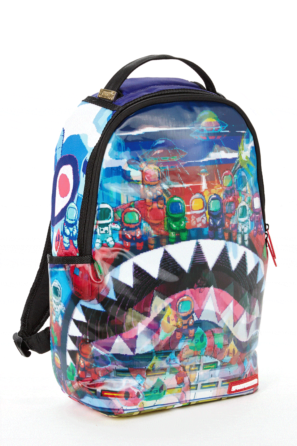ExteriorDimensions: 18' x 6' x 11.5' ∙ Front zipper pocket ∙ Side pockets ∙ Zippered Stash pocket ∙ Ergonomic mesh back padding ∙ Adjustable Straps for custom sizing ∙ Nylon Zippers with Metal Hardware ∙ Metal 'Sprayground Authentic' badge ∙ Slide through back sleeve connects to Carry on luggage to free your hands