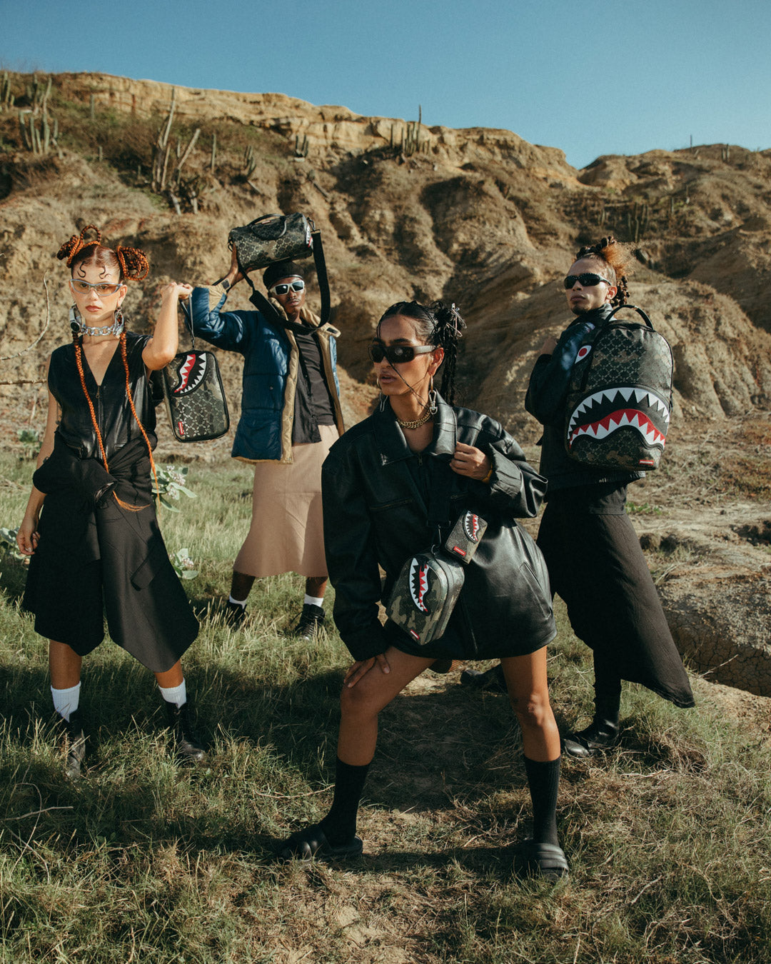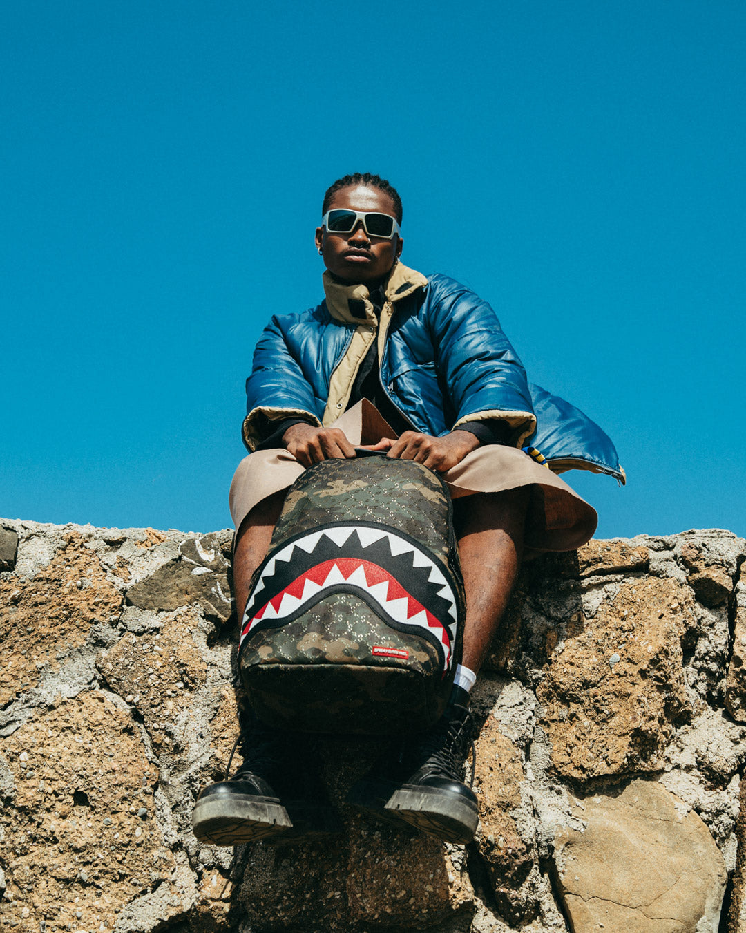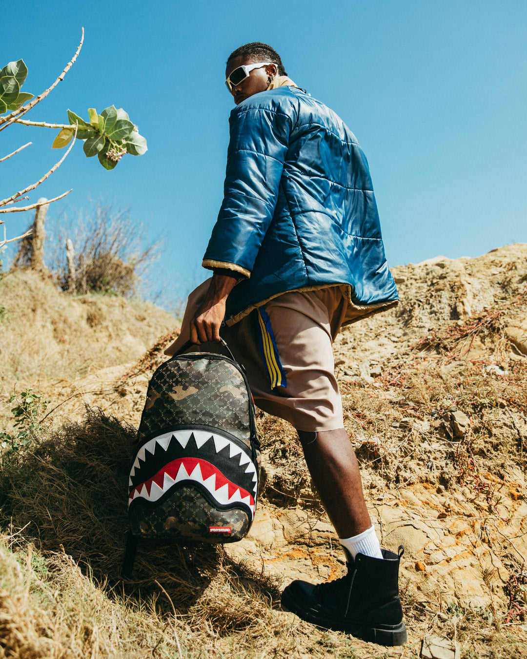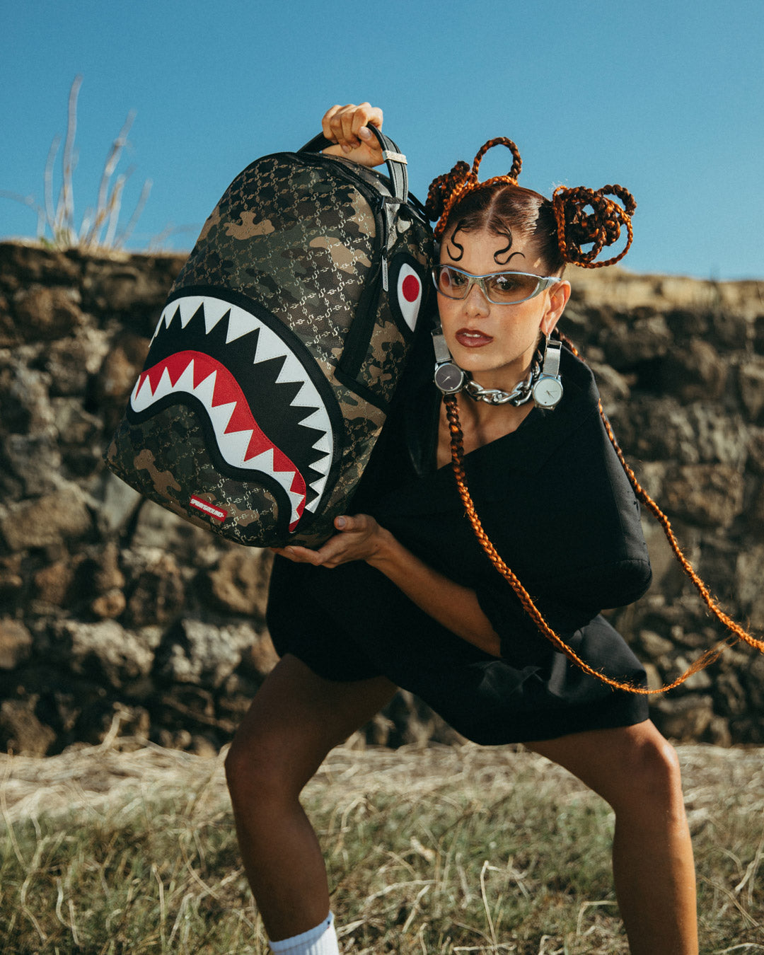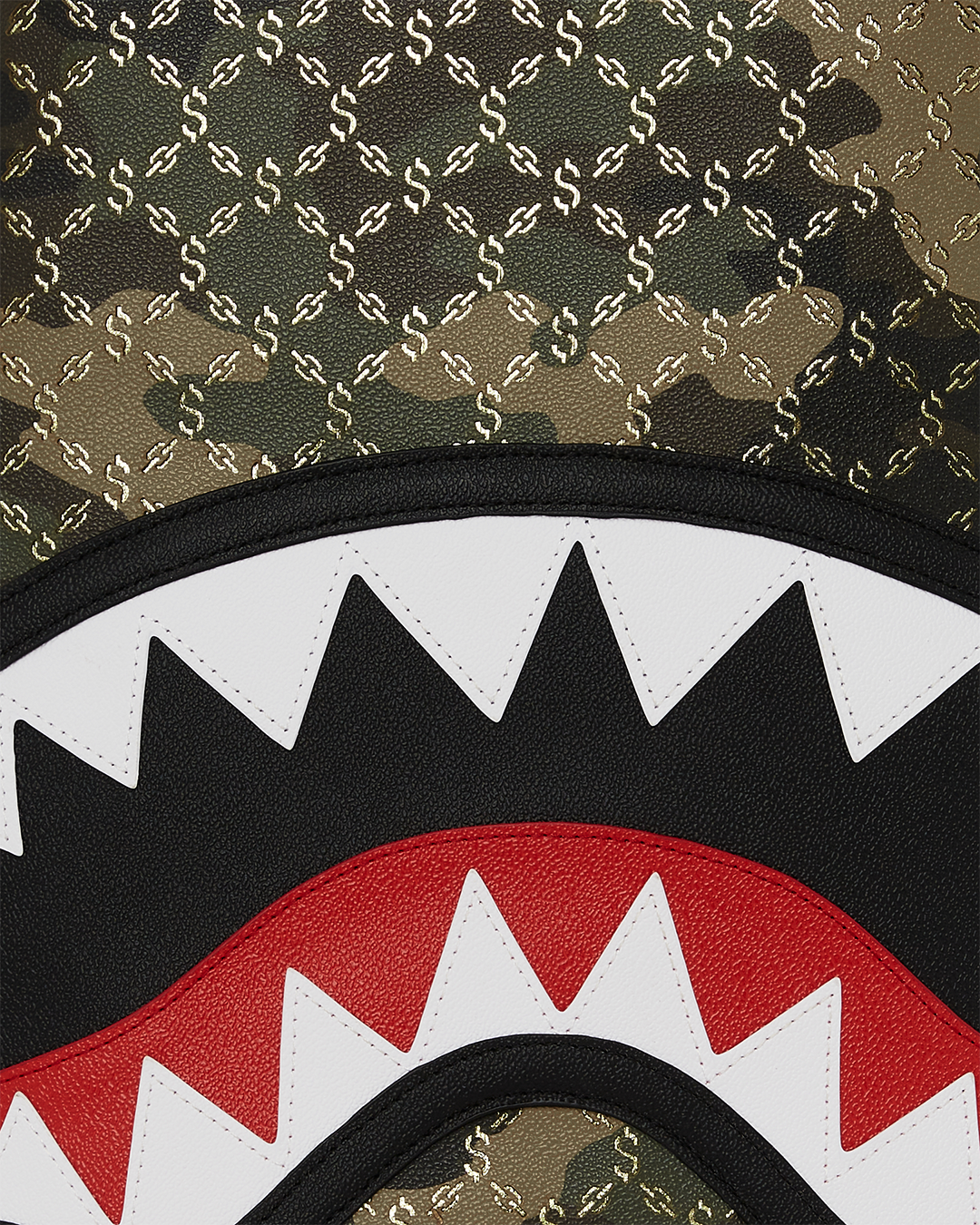 Dimensions: 18' x 6' x 11.5' • Front zipper pocket • Side pockets • Zippered Stash pocket • Separate velour sunglass compartment • Ergonomic mesh back padding • Adjustable Straps for custom sizing • Gold zippers with metal hardware • Metal 'Sprayground Authentic' badge • Slide through back sleeve connects to carry-on luggage to free your hands