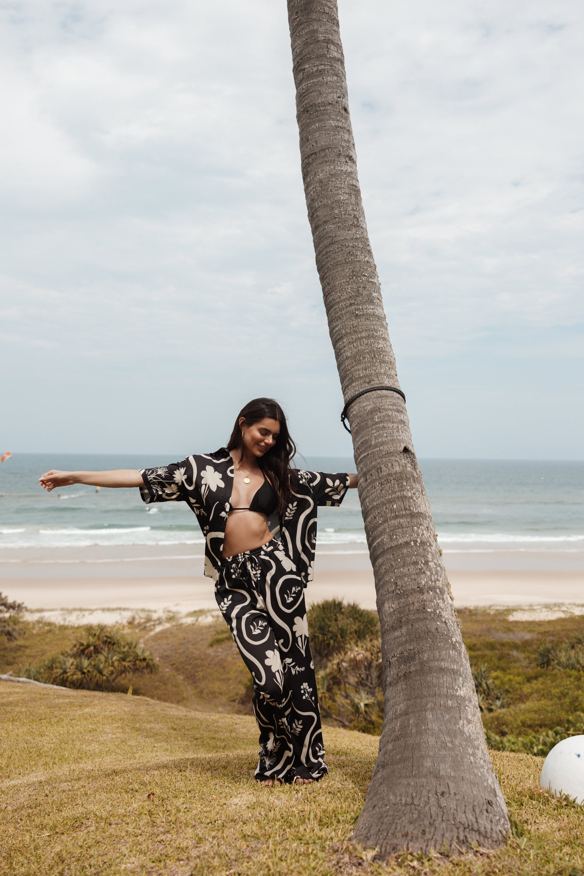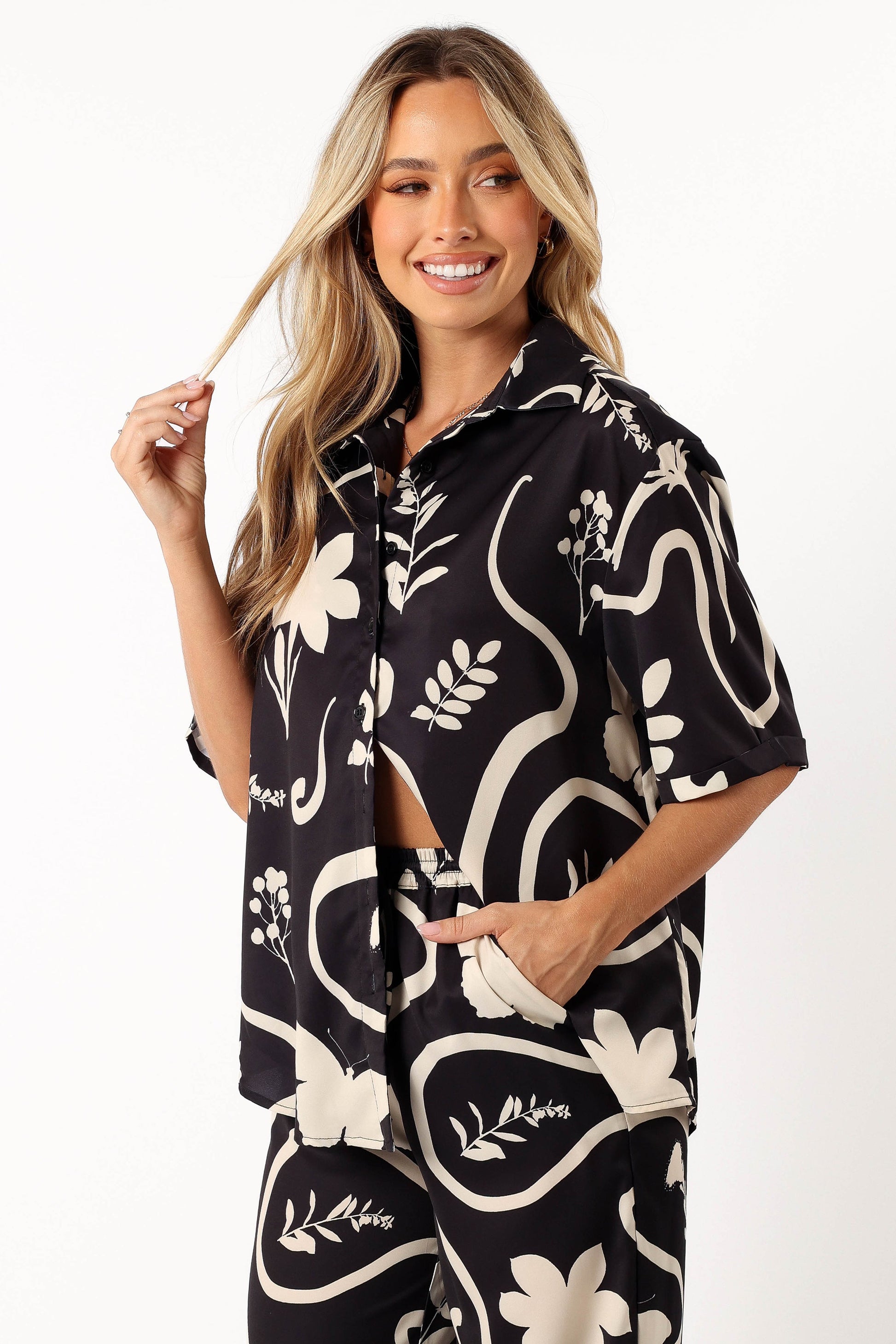 DETAILS Embrace the playful elegance with our Leo Shirt, boasting a striking large floral print that screams fun and trendy. Featuring a chic spread collar and a flattering V-neckline, this gem is all about details. Its short sleeves and functional buttons down the front add a touch of fashion-forward sophistication.
