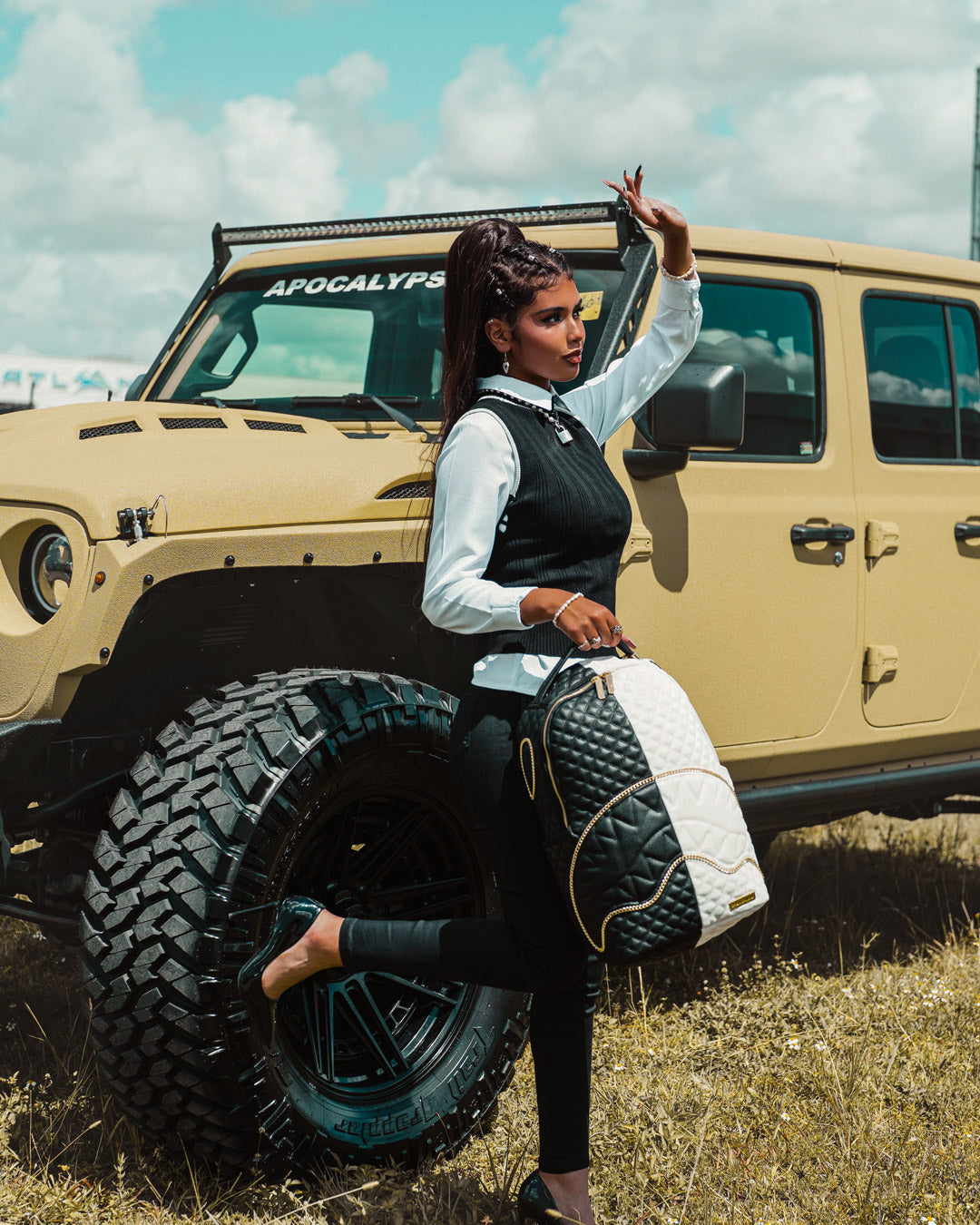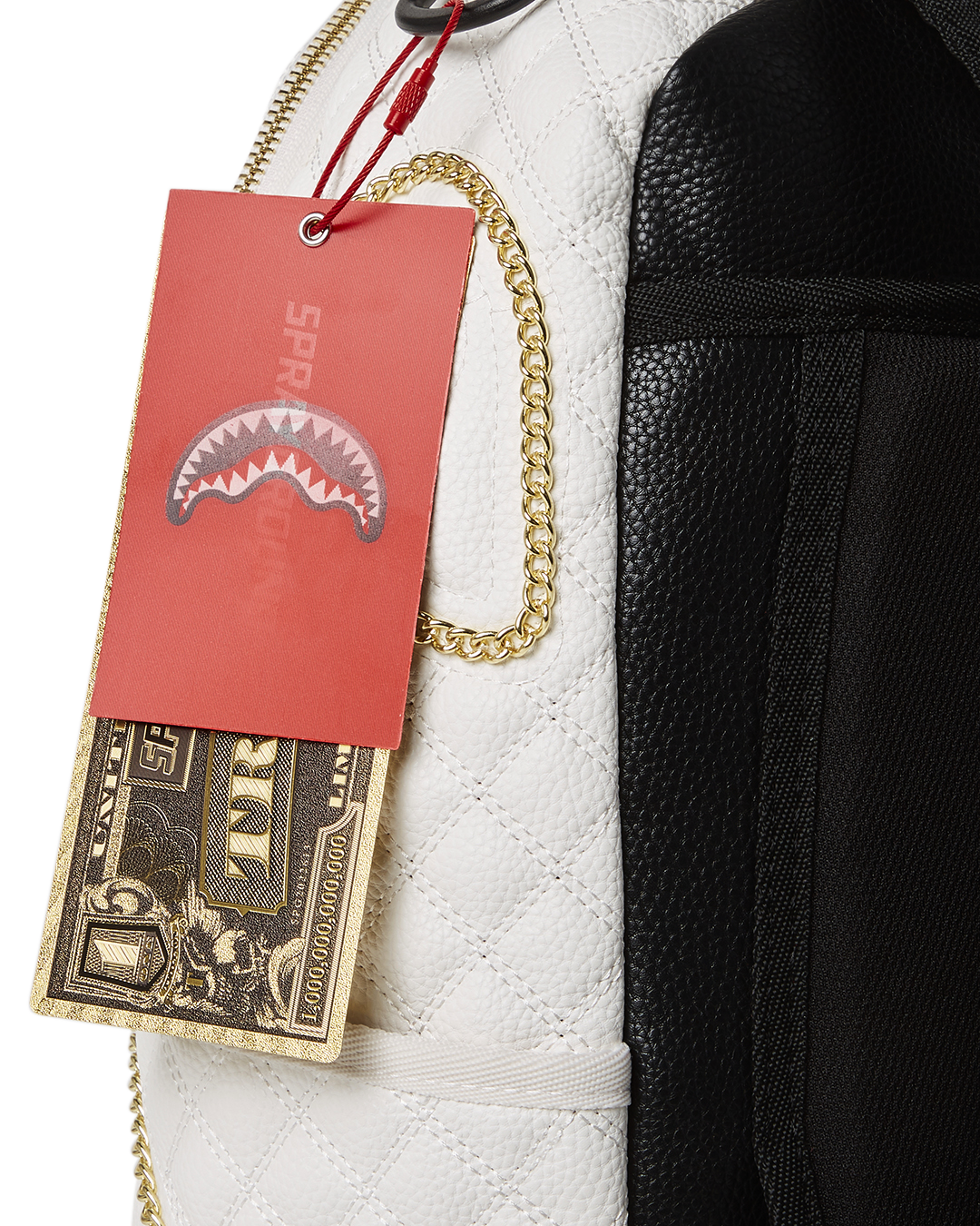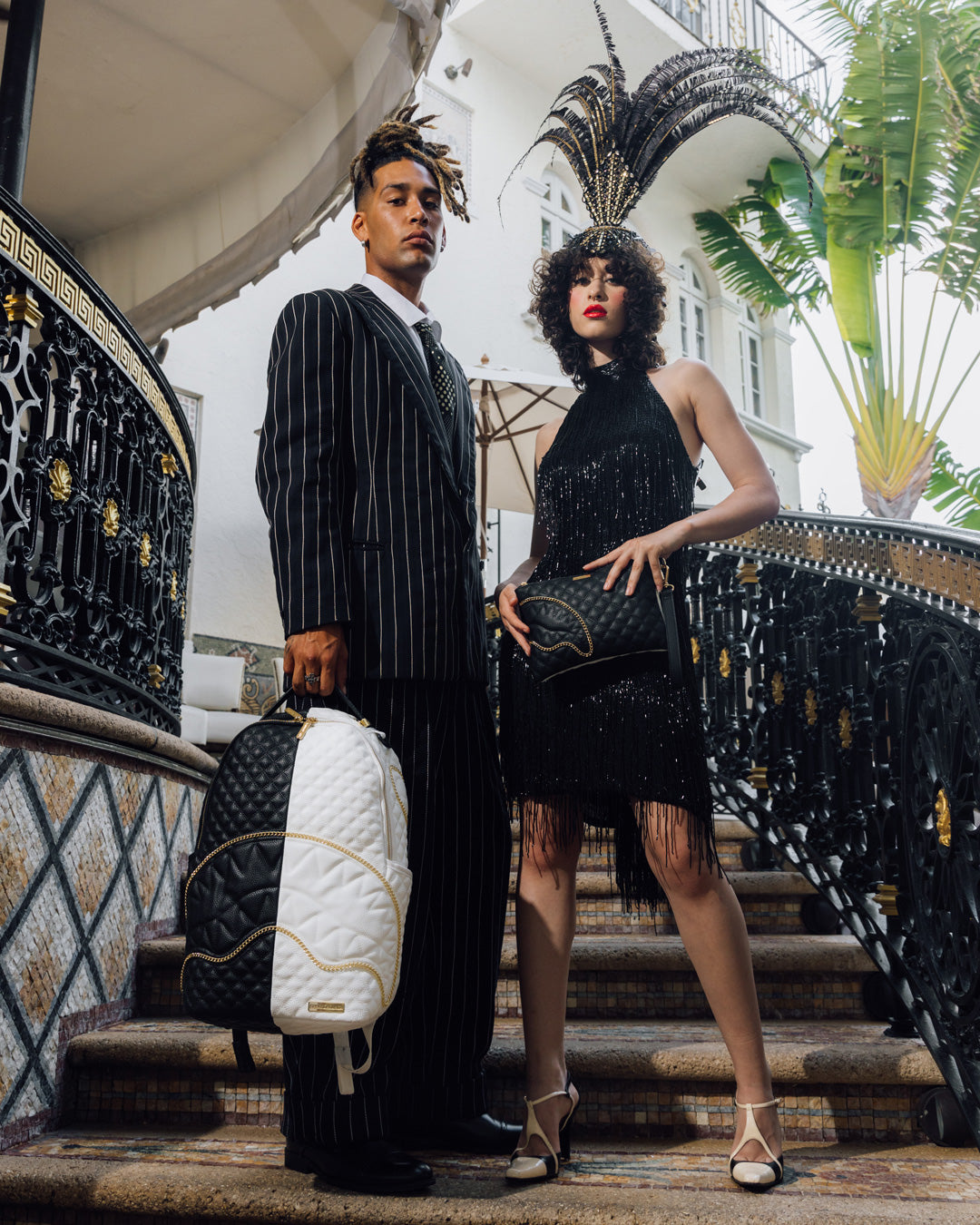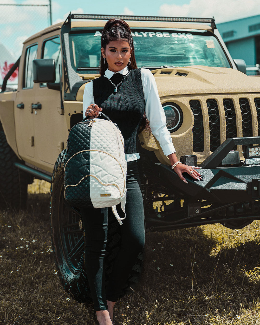 Dimensions: 18' x 6' x 11.5' • Front zipper pocket • Side pockets • Zippered Stash pocket • Separate velour sunglass compartment • Ergonomic mesh back padding • Adjustable Straps for custom sizing • Gold zippers with metal hardware • Metal 'Sprayground Authentic' badge • Slide through back sleeve connects to carry-on luggage to free your hands