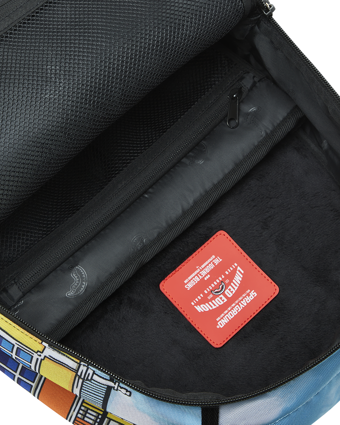 Dimensions: 18' x 6' x 11.5' • Front zipper pocket • Side pockets • Zippered Stash pocket • Separate velour sunglass compartment • Ergonomic mesh back padding • Adjustable Straps for custom sizing • Gold zippers with metal hardware • Metal 'Sprayground Authentic' badge • Slide through back sleeve connects to carry-on luggage to free your hands