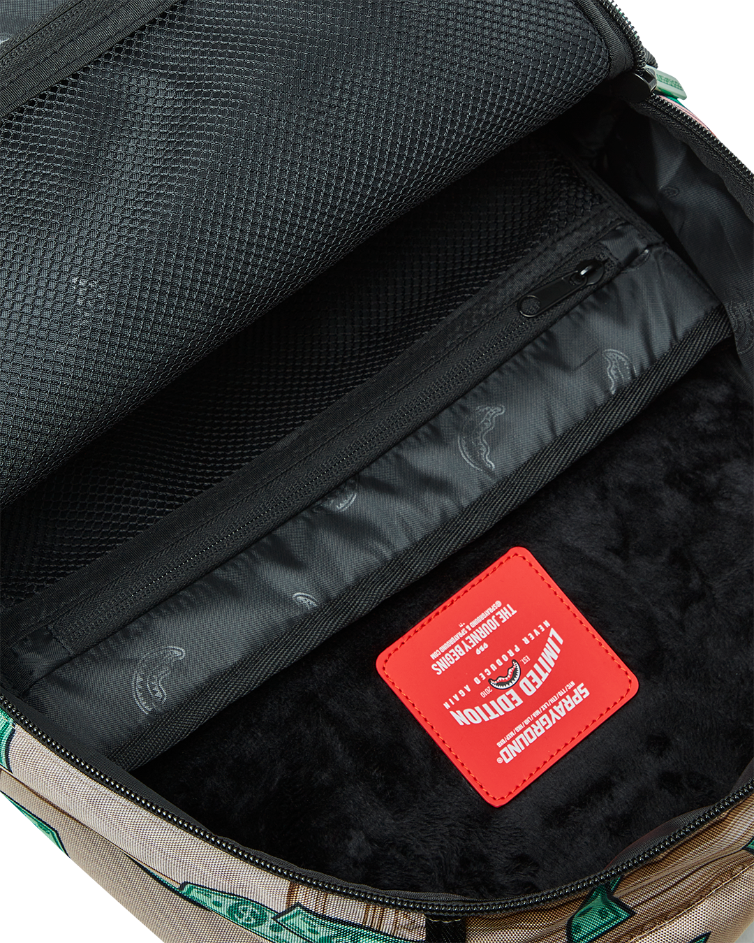 Dimensions: 18' x 6' x 11.5' • Front zipper pocket • Side pockets • Zippered Stash pocket • Separate velour sunglass compartment • Ergonomic mesh back padding • Adjustable Straps for custom sizing • Gold zippers with metal hardware • Metal 'Sprayground Authentic' badge • Slide through back sleeve connects to carry-on luggage to free your hands