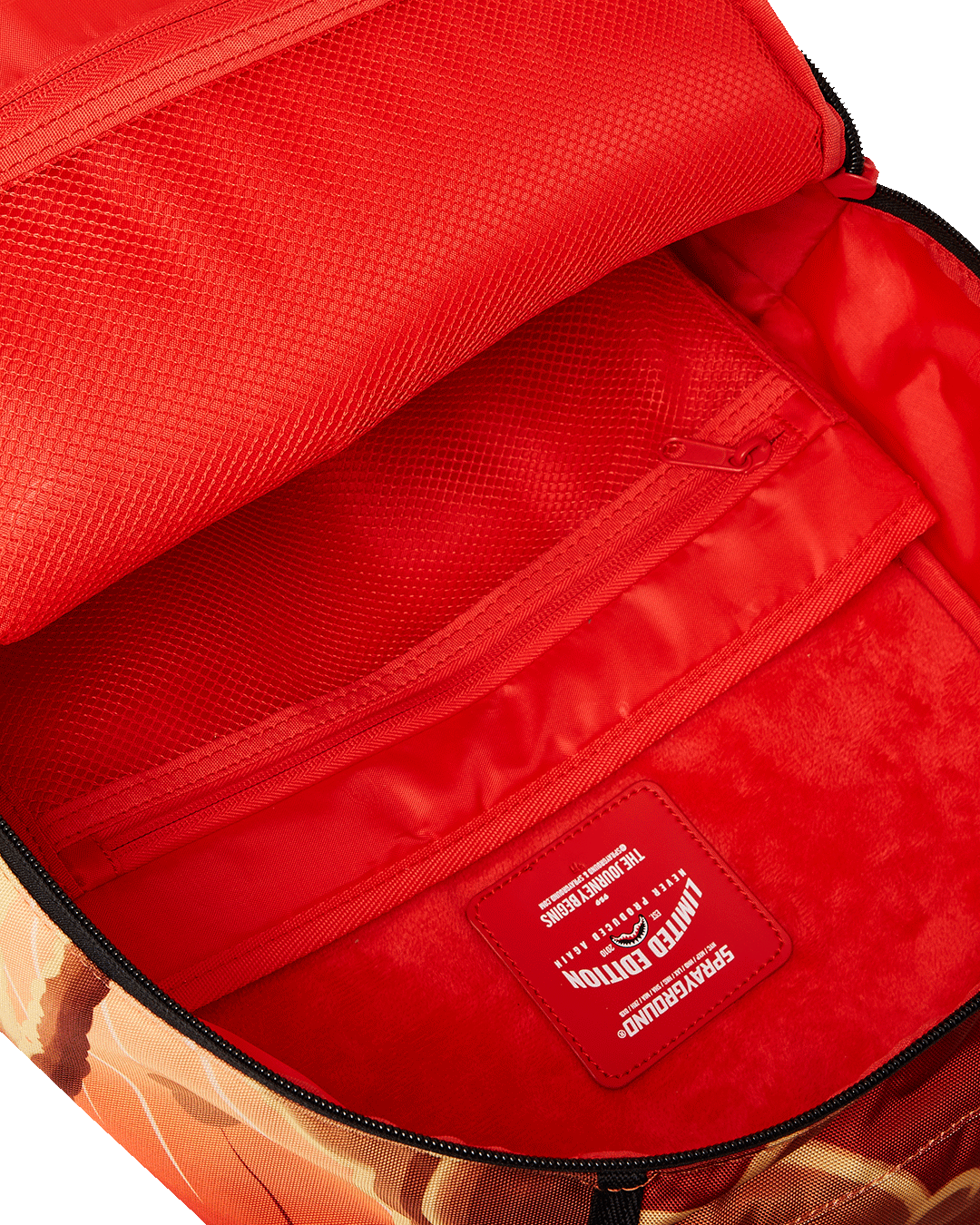 Dimensions: 18' x 6' x 11.5' • Front zipper pocket • Side pockets • Zippered Stash pocket • Separate velour sunglass compartment • Ergonomic mesh back padding • Adjustable Straps for custom sizing • Gold zippers with metal hardware • Metal 'Sprayground Authentic' badge • Slide through back sleeve connects to carry-on luggage to free your hands