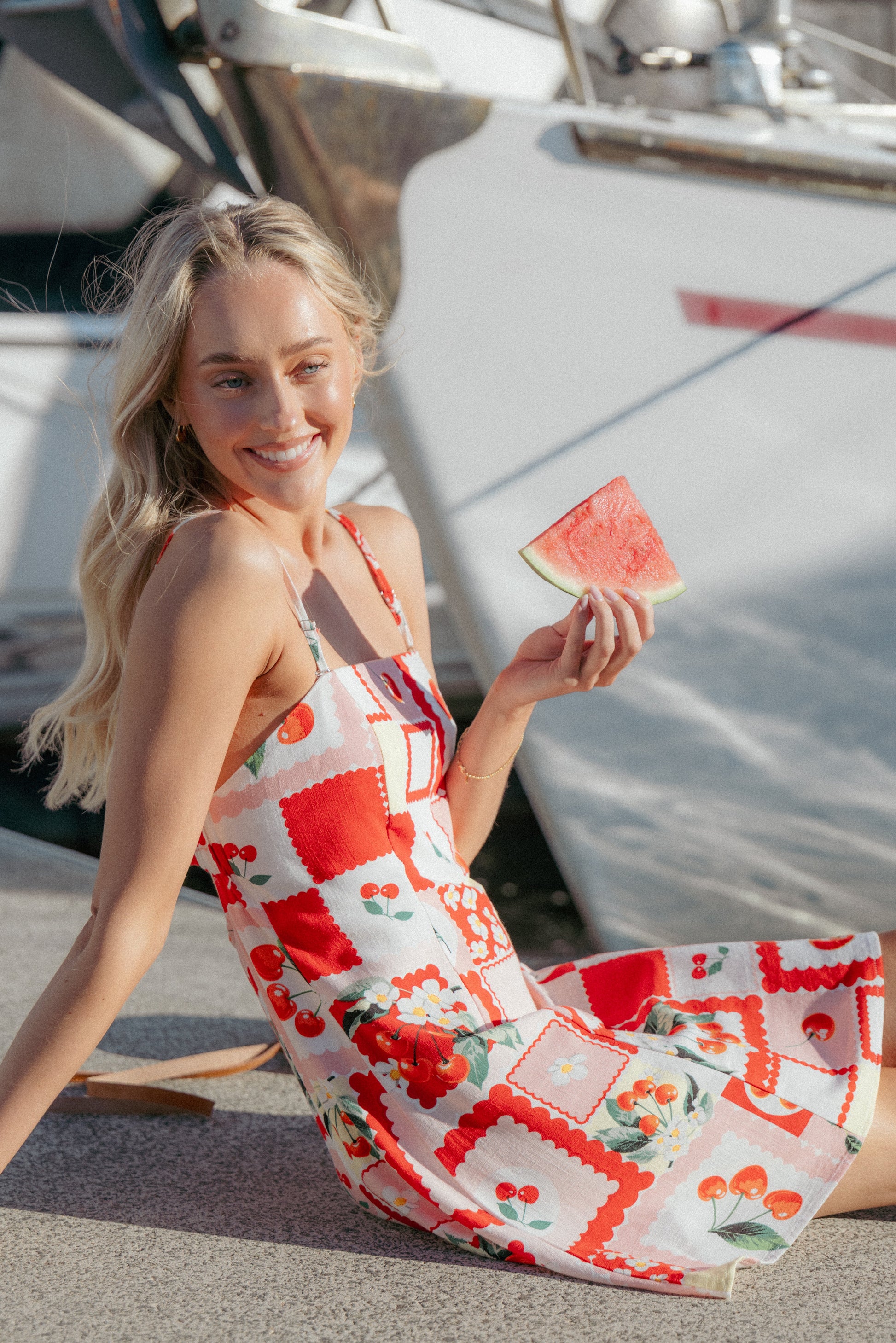 DETAILS Make a statement this season with the Almudena Midi Dress in vibrant cherry red. Featuring a fun fruit cherry print, this eye-catching dress perfectly balances playful charm with effortless elegance.