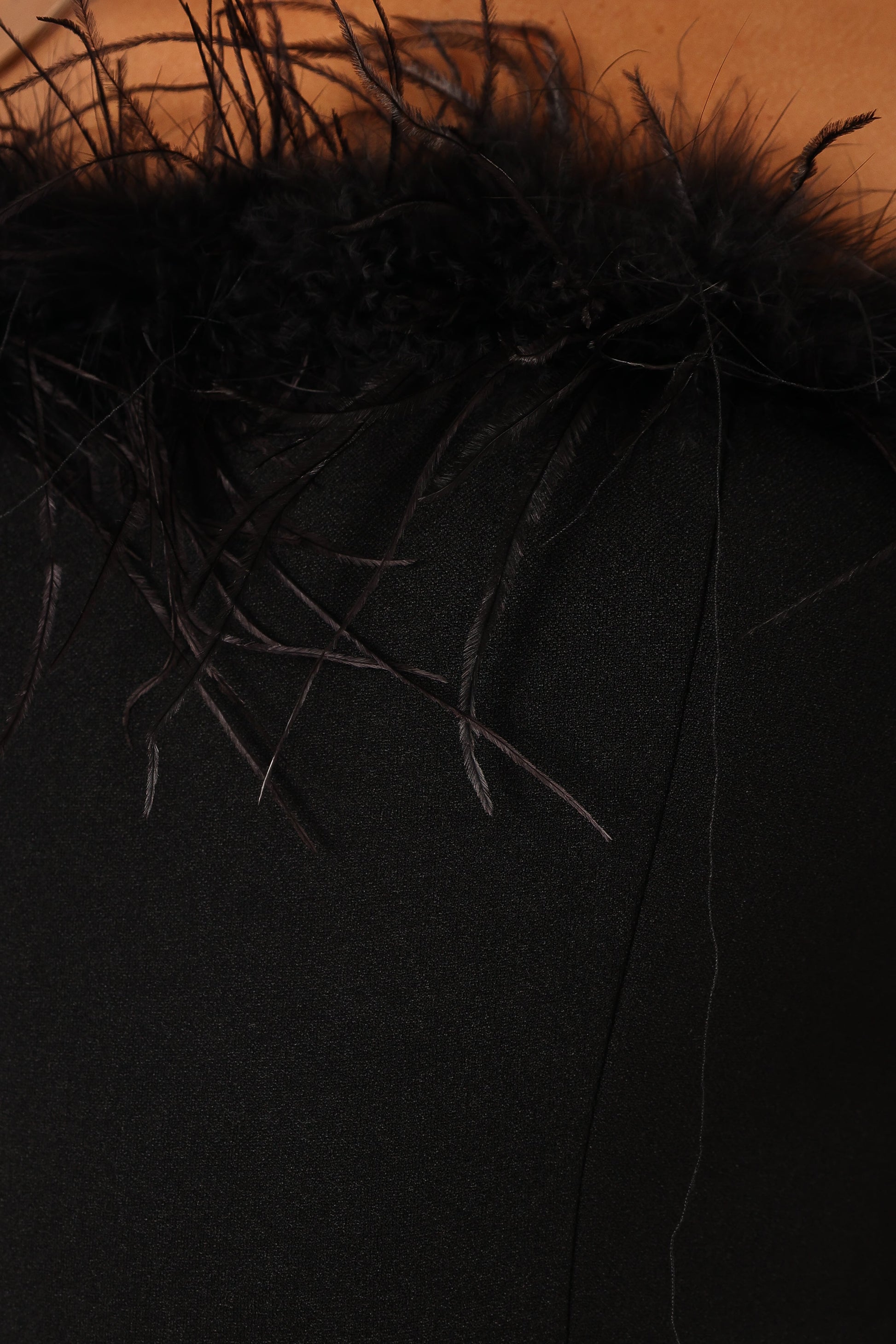 DETAILS Steal the scene with our feathered finesse! This strapless design exudes a playful vibe with a straight neckline adorned in plush feather trim. The invisible zip at the back secures the outfit and a hook and eye clasp adds a trendy touch, ensuring you're always in vogue.