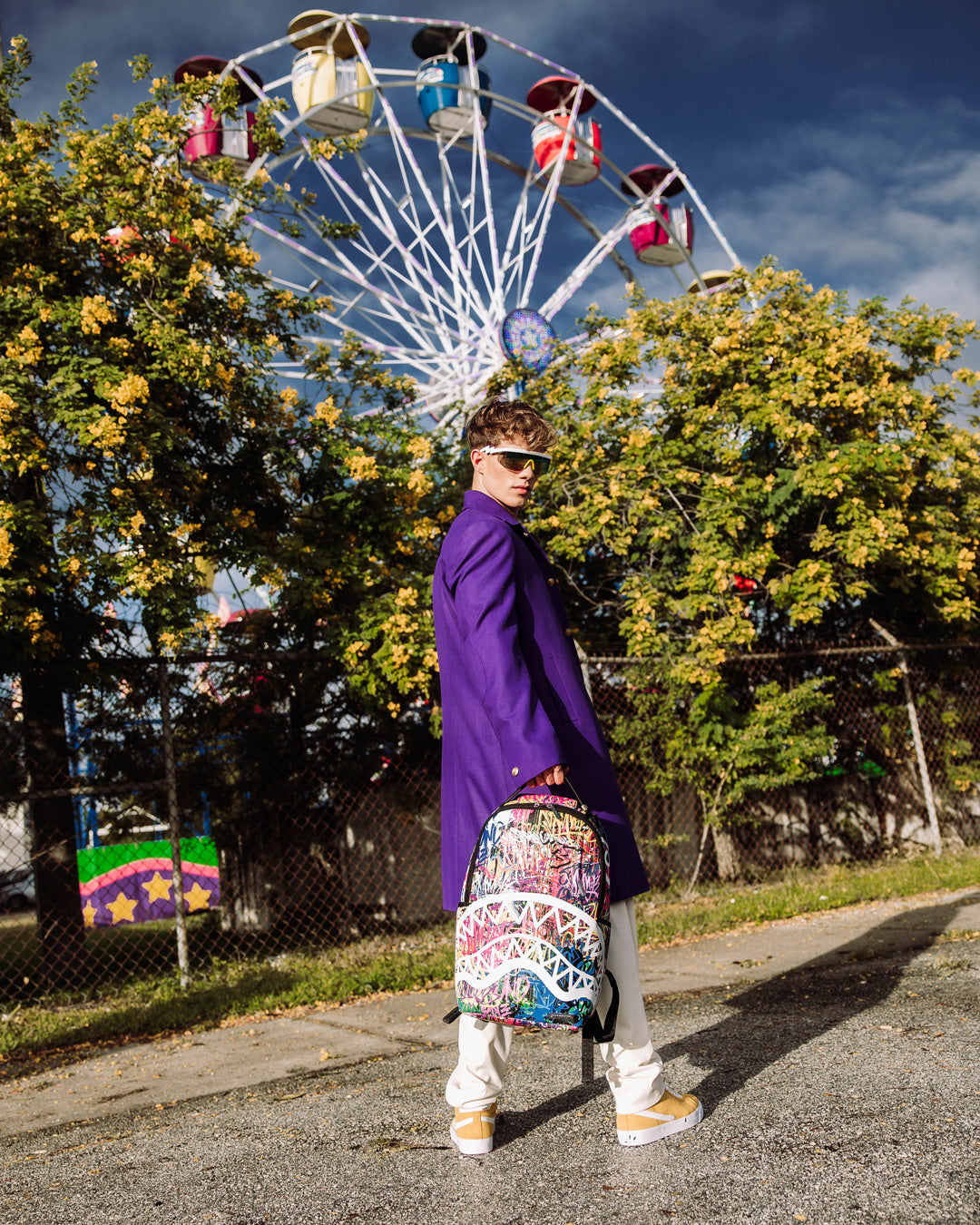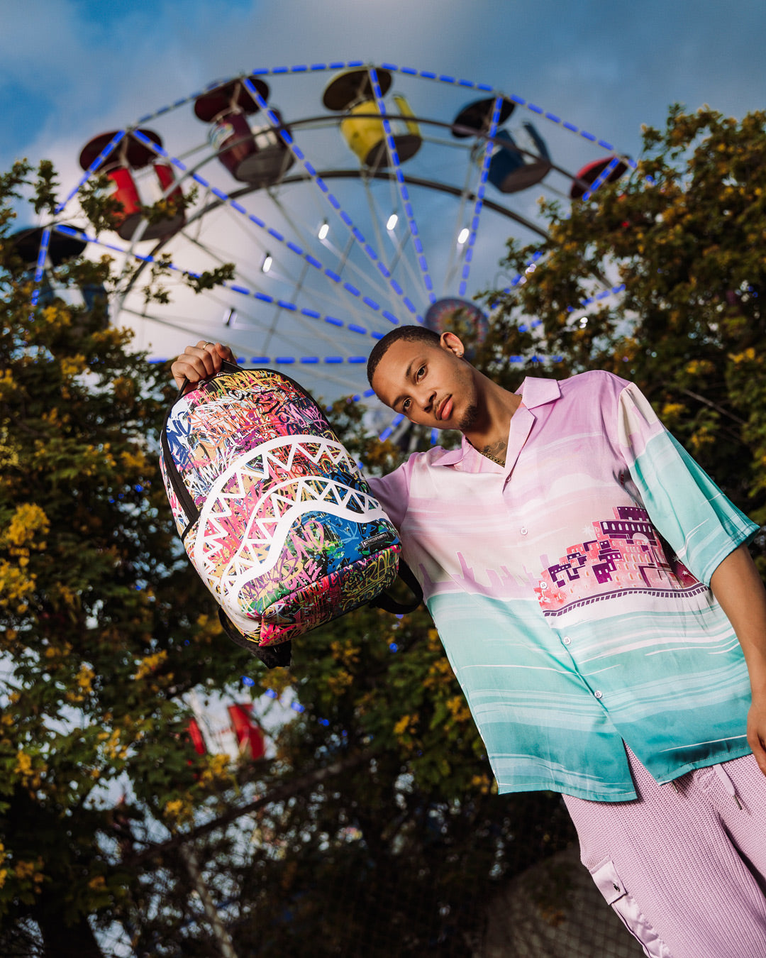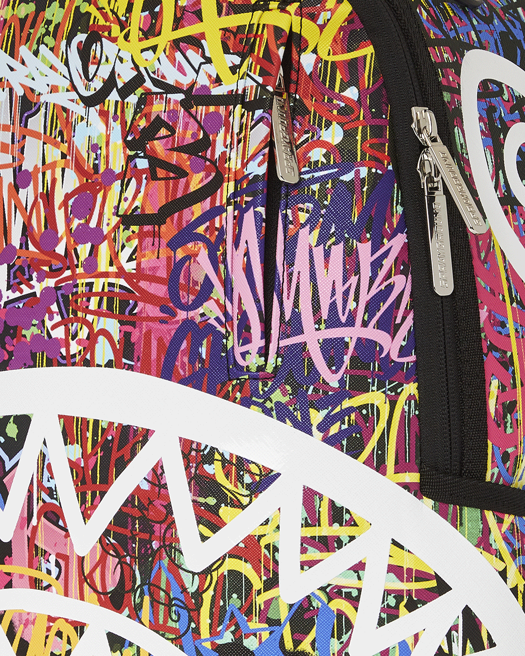 Dimensions: 18' x 6' x 11.5' • Front zipper pocket • Side pockets • Zippered Stash pocket • Separate velour sunglass compartment • Ergonomic mesh back padding • Adjustable Straps for custom sizing • Gold zippers with metal hardware • Metal 'Sprayground Authentic' badge • Slide through back sleeve connects to carry-on luggage to free your hands