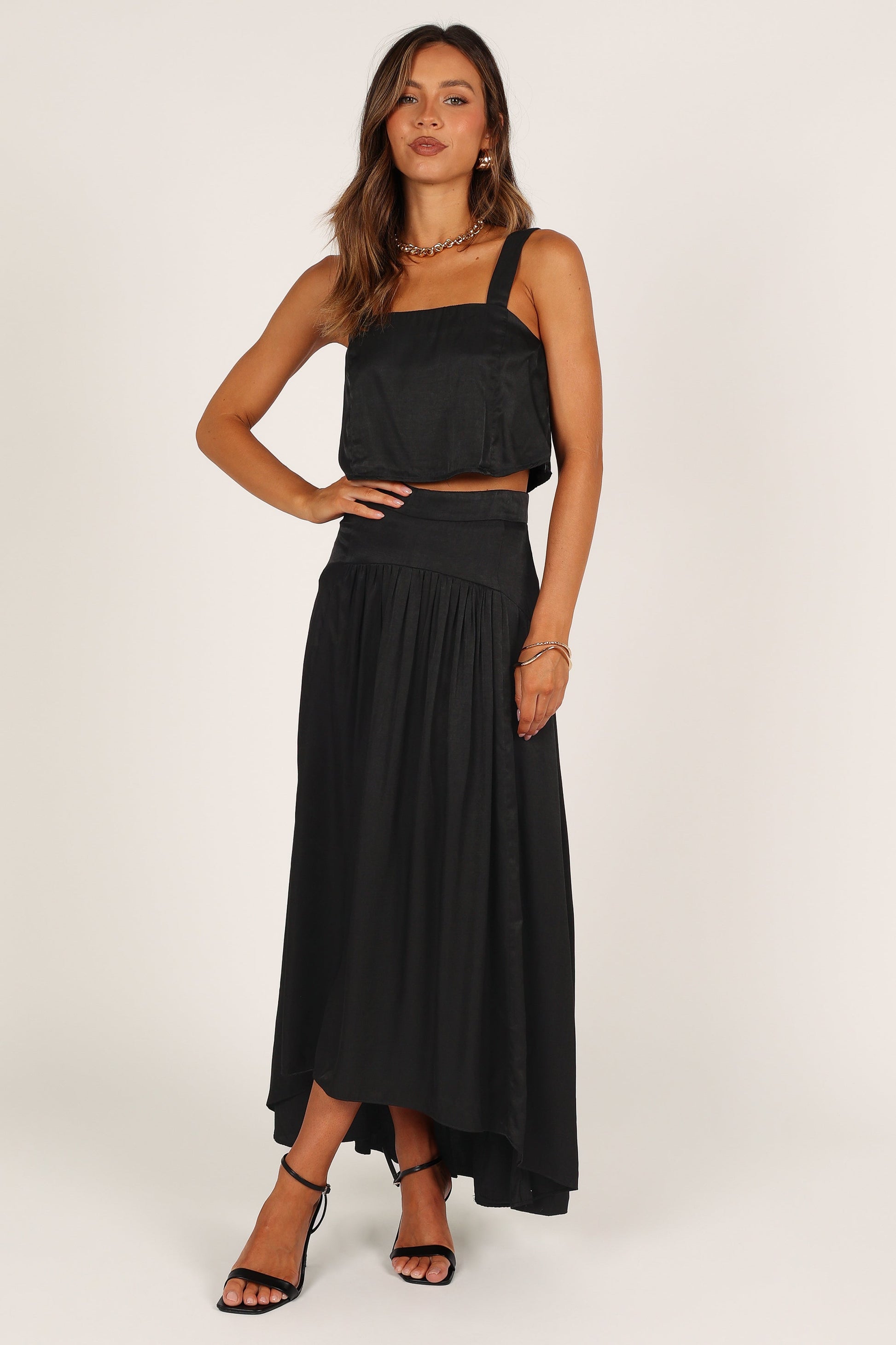 DETAILS Feel your most confident and feminine in this stylish crop and skirt set. Featuring a cropped length top with non adjustable straps, straight neckline, and side invisible zip for an easy fit. Complete the look with a high-low skirt featuring an elasticised waistband at back, side invisible zip.