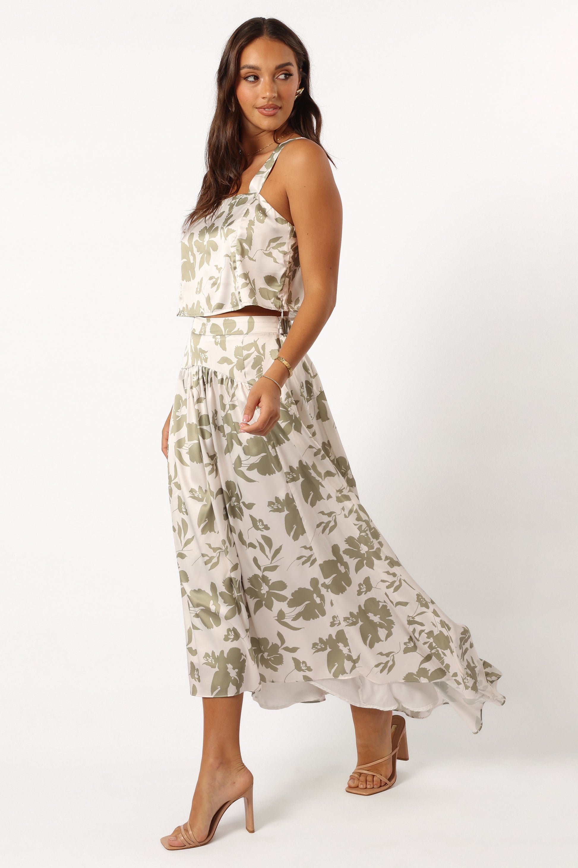 | DETAILS Feel your most confident and feminine in this stylish crop and skirt set. Featuring a cropped length top with non adjustable straps, straight neckline, and side invisible zip for an easy fit. Complete the look with a high-low skirt featuring an elasticised waistband at back, side invisible zip, and oh-so stunning color block print.