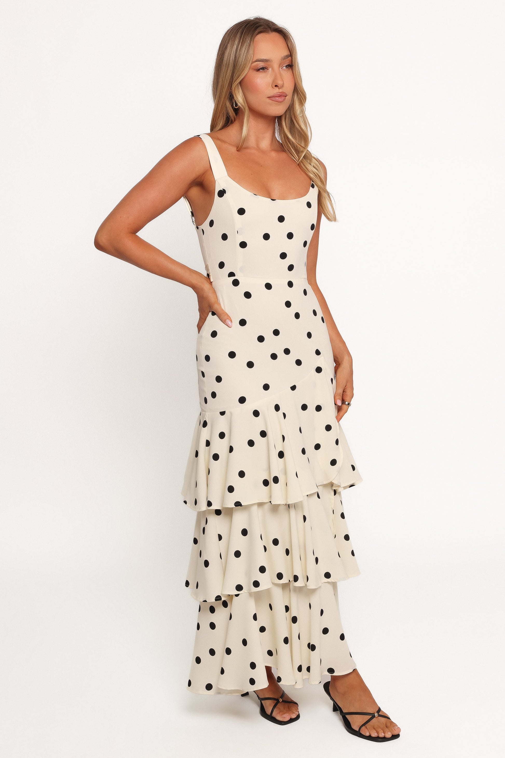 DETAILS Featuring a timeless black polka dot print on flowing fabric, this dress combines sophistication with a playful edge. Designed with a flattering square neckline and thick adjustable straps for ultimate comfort, it also features structured boning in the bust and an elasticised shirred back panel for a secure yet flexible fit.