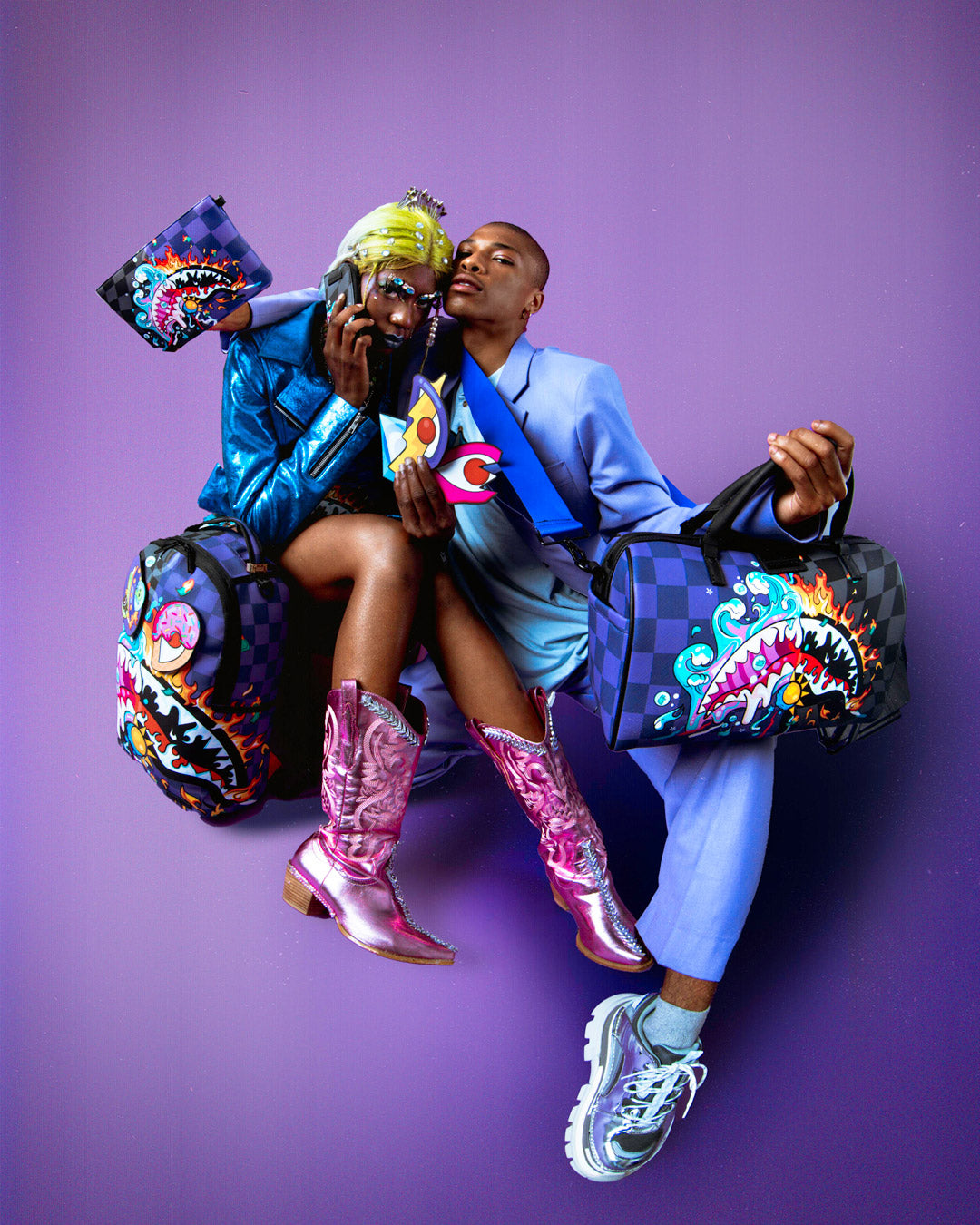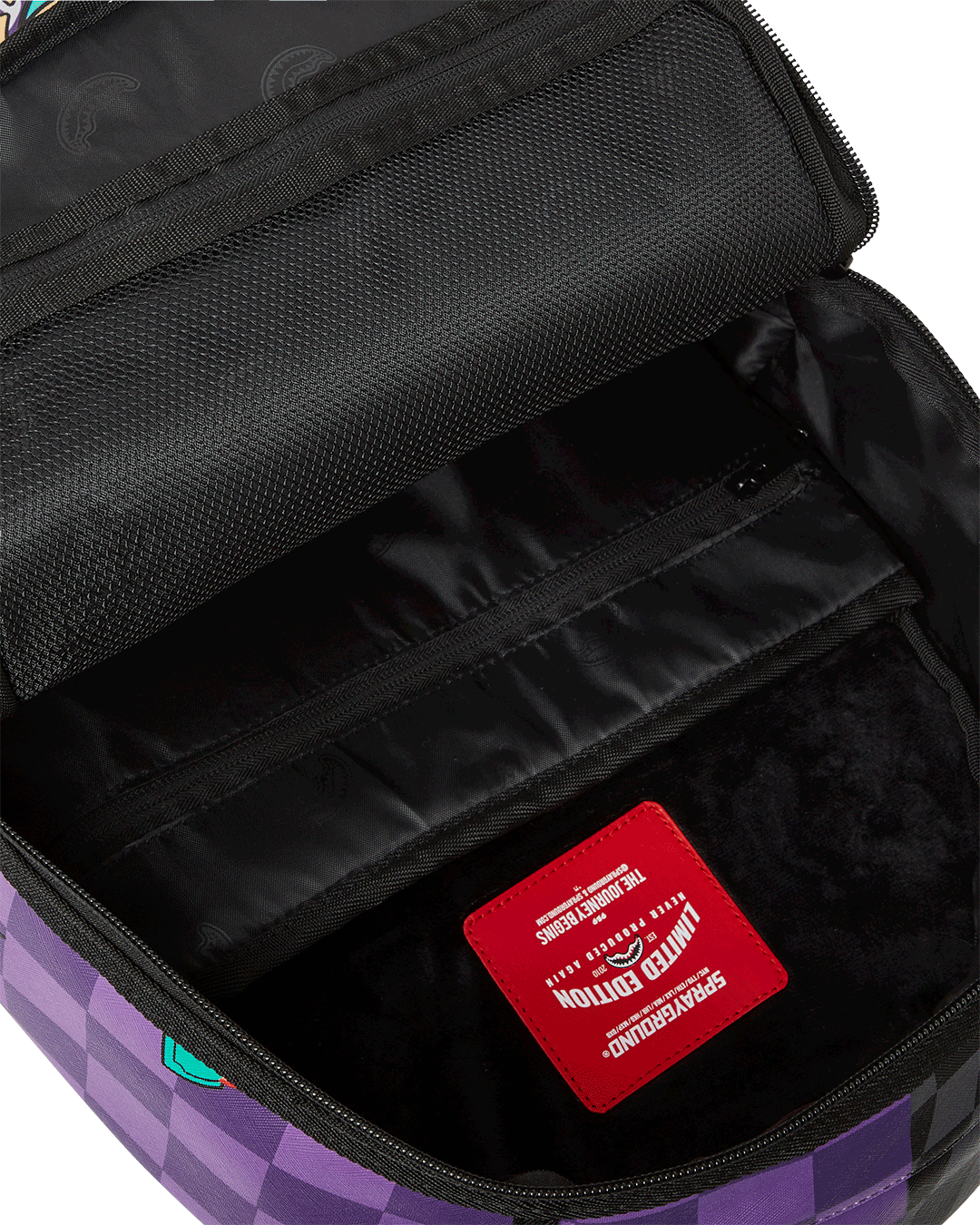 Dimensions: 18' x 6' x 11.5' • Front zipper pocket • Side pockets • Zippered Stash pocket • Separate velour sunglass compartment • Ergonomic mesh back padding • Adjustable Straps for custom sizing • Gold zippers with metal hardware • Metal 'Sprayground Authentic' badge • Slide through back sleeve connects to carry-on luggage to free your hands