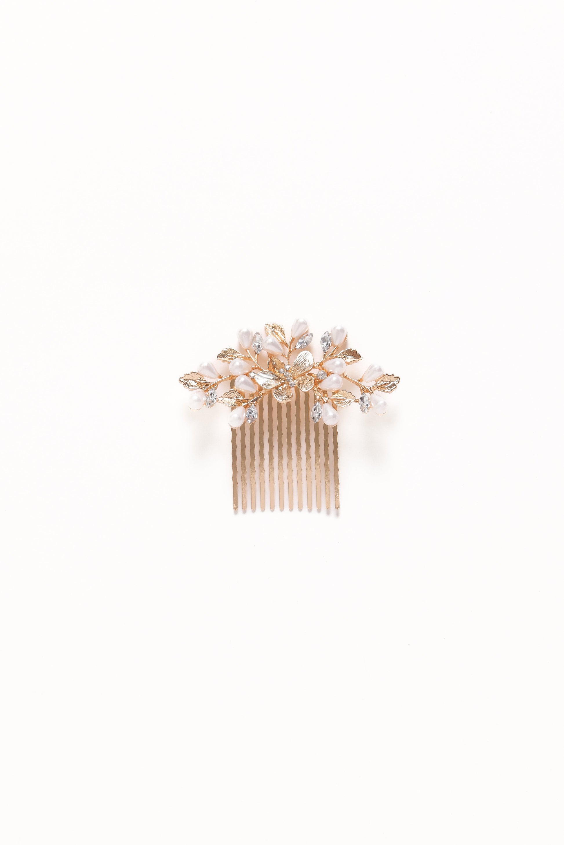 | DETAILS Add a touch of elegance to any look with the Madelaine Hair Comb in Gold and Pearl. Featuring a delicate floral design accented with shimmering rhinestones and soft faux pearls, this piece instantly elevates your hairstyle.