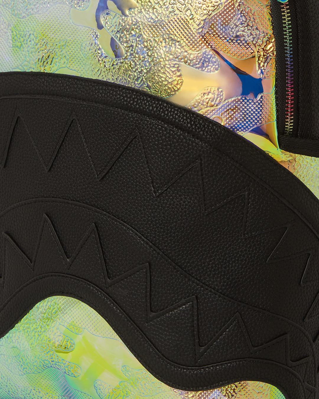 Dimensions: 18' x 6' x 11.5' • Front zipper pocket • Side pockets • Zippered Stash pocket • Separate velour sunglass compartment • Ergonomic mesh back padding • Adjustable Straps for custom sizing • Red zippers with metal hardware • Metal 'Sprayground Authentic' badge • Slide through back sleeve connects to carry-on luggage to free your hands