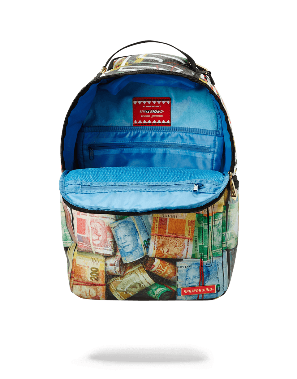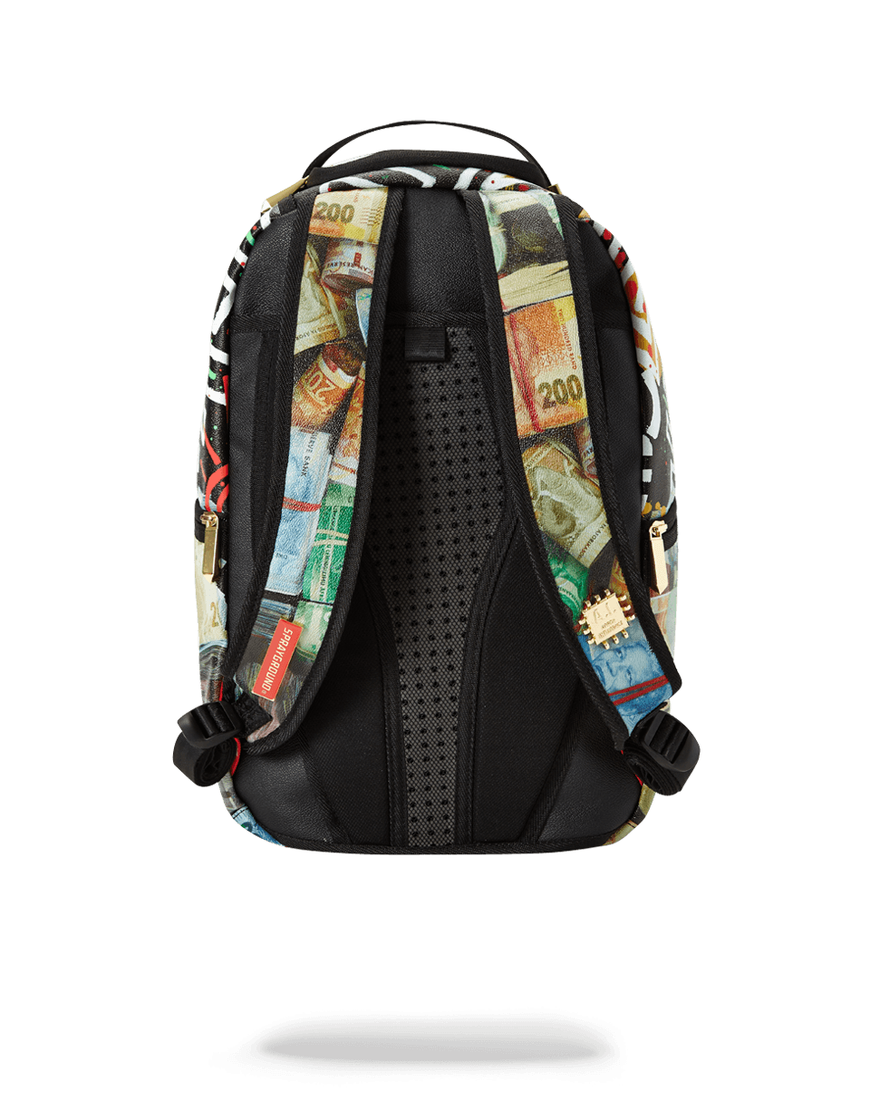 ExteriorDimensions: 18' x 6' x 11.5' ∙ Front zipper pocket ∙ Side pockets ∙ Zippered Stash pocket ∙ Ergonomic mesh back padding ∙ Adjustable Straps for custom sizing ∙ Nylon Zippers with Metal Hardware ∙ Metal 'Sprayground Authentic' badge ∙ Slide through back sleeve connects to Carry on luggage to free your hands