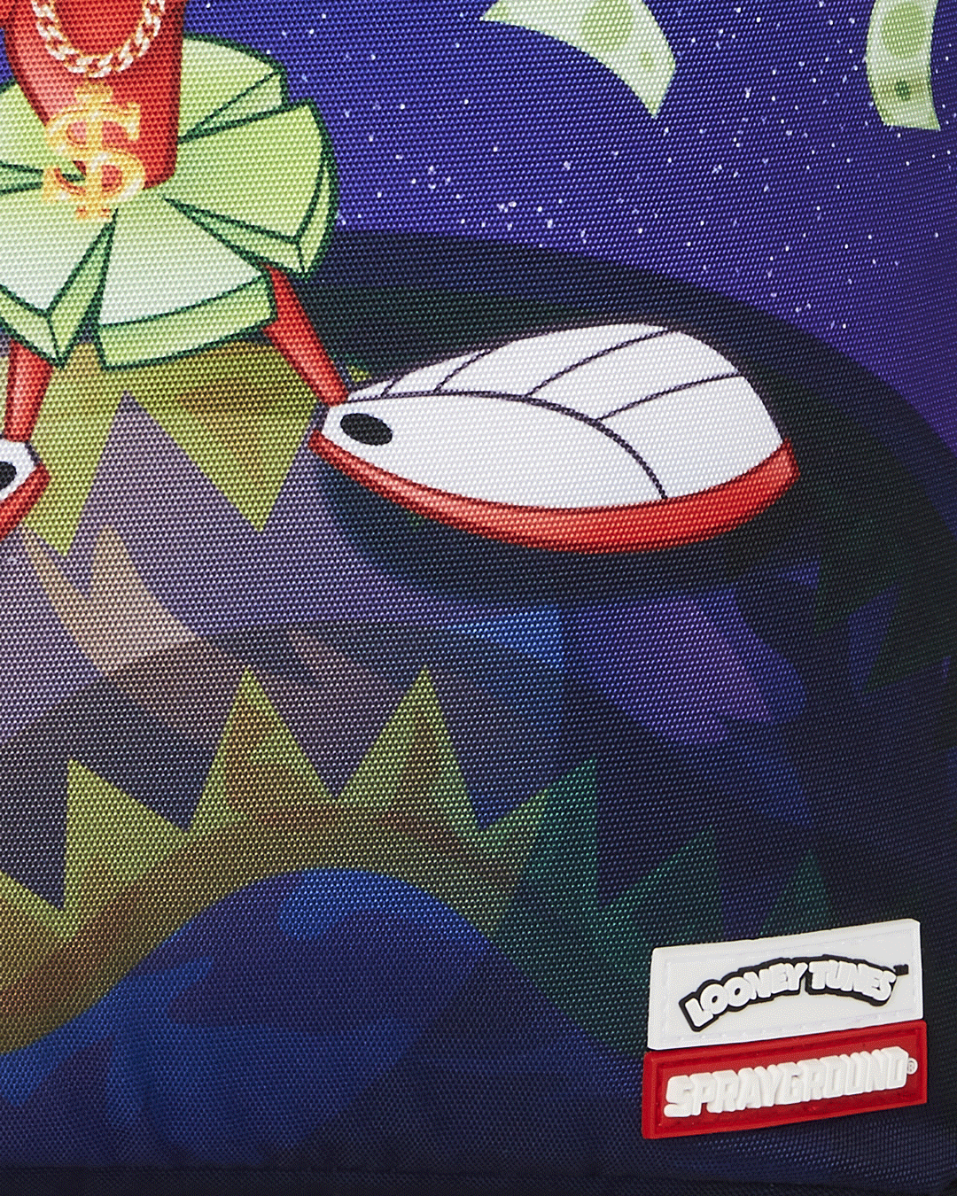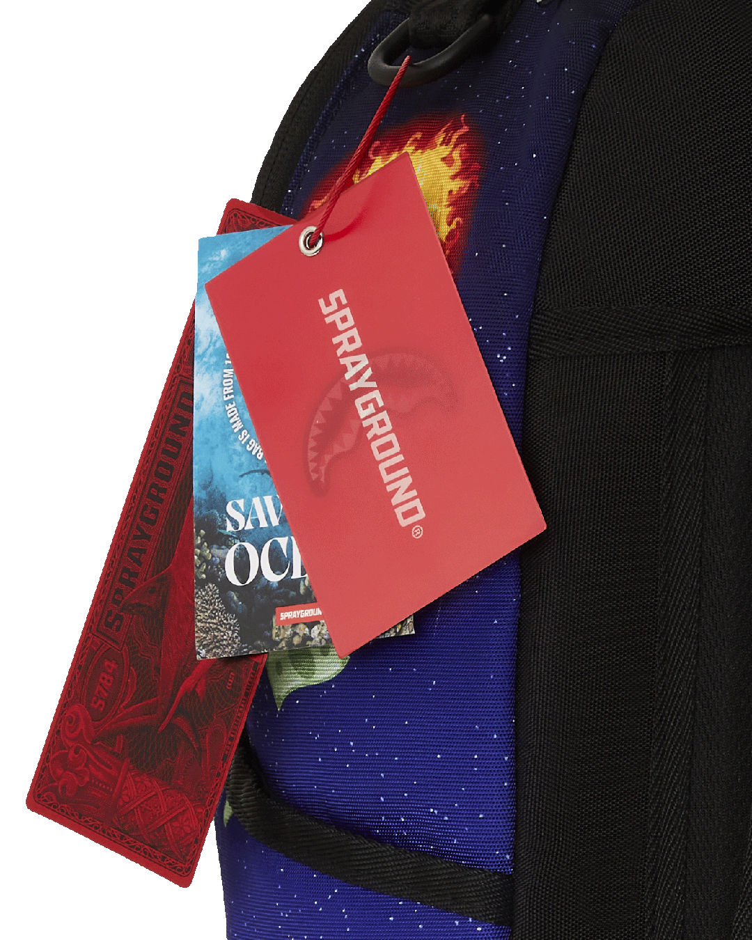 Dimensions: 18' x 6' x 11.5' • Front zipper pocket • Side pockets • Zippered Stash pocket • Separate velour sunglass compartment • Ergonomic mesh back padding • Adjustable Straps for custom sizing • Gold zippers with metal hardware • Metal 'Sprayground Authentic' badge • Slide through back sleeve connects to carry-on luggage to free your hands