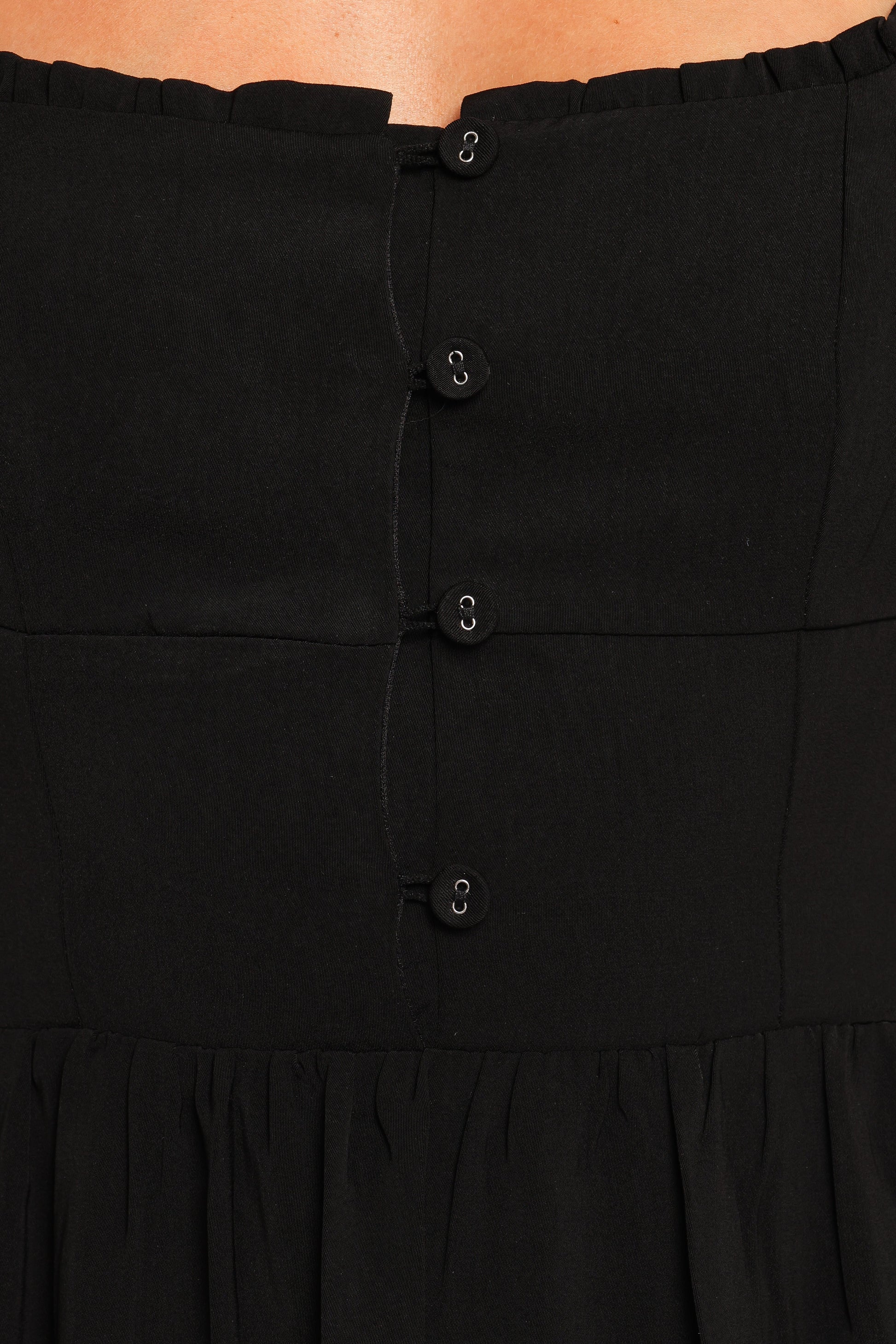 DETAILS Effortlessly chic meets everyday elegance with the Melrose Midi Dress in black. Designed with a flattering square neckline and a functional button-down bust, this piece combines timeless detail with modern practicality.