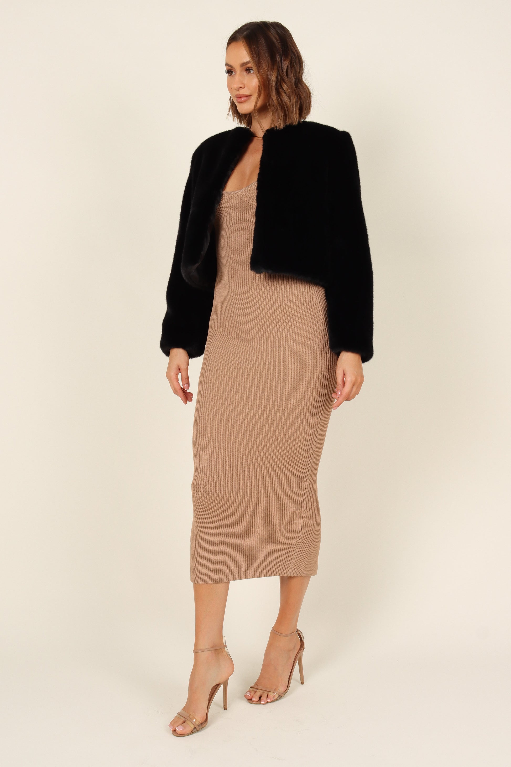 DETAILS This gorgeous jacket is the perfect way to stay stylish and warm no matter what the temperature. It features a cropped length, hook and eye close on front, long sleeves, functional side pockets and faux fur soft feel that will keep you feeling cosy all season long.