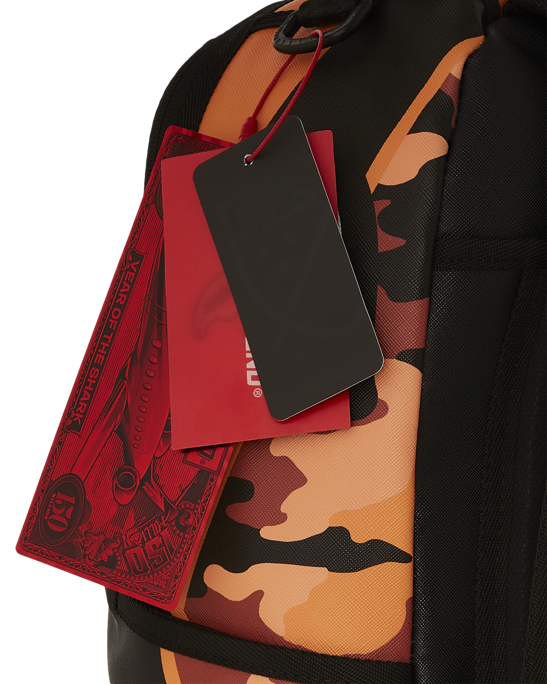 Dimensions: 18' x 6' x 11.5' • Front zipper pocket • Side pockets • Zippered Stash pocket • Separate velour sunglass compartment • Ergonomic mesh back padding • Adjustable Straps for custom sizing • Gold zippers with metal hardware • Metal 'Sprayground Authentic' badge • Slide through back sleeve connects to carry-on luggage to free your hands