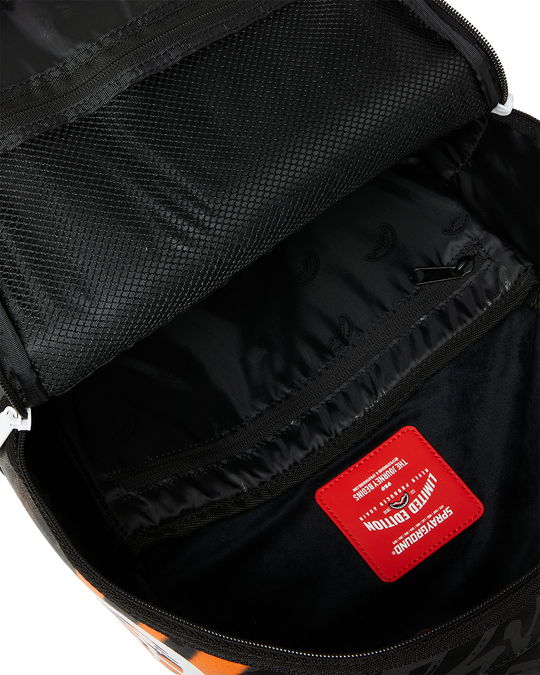 Dimensions: 18' x 6' x 11.5' • Front zipper pocket • Side pockets • Zippered Stash pocket • Separate velour sunglass compartment • Ergonomic mesh back padding • Adjustable Straps for custom sizing • Gold zippers with metal hardware • Metal 'Sprayground Authentic' badge • Slide through back sleeve connects to carry-on luggage to free your hands
