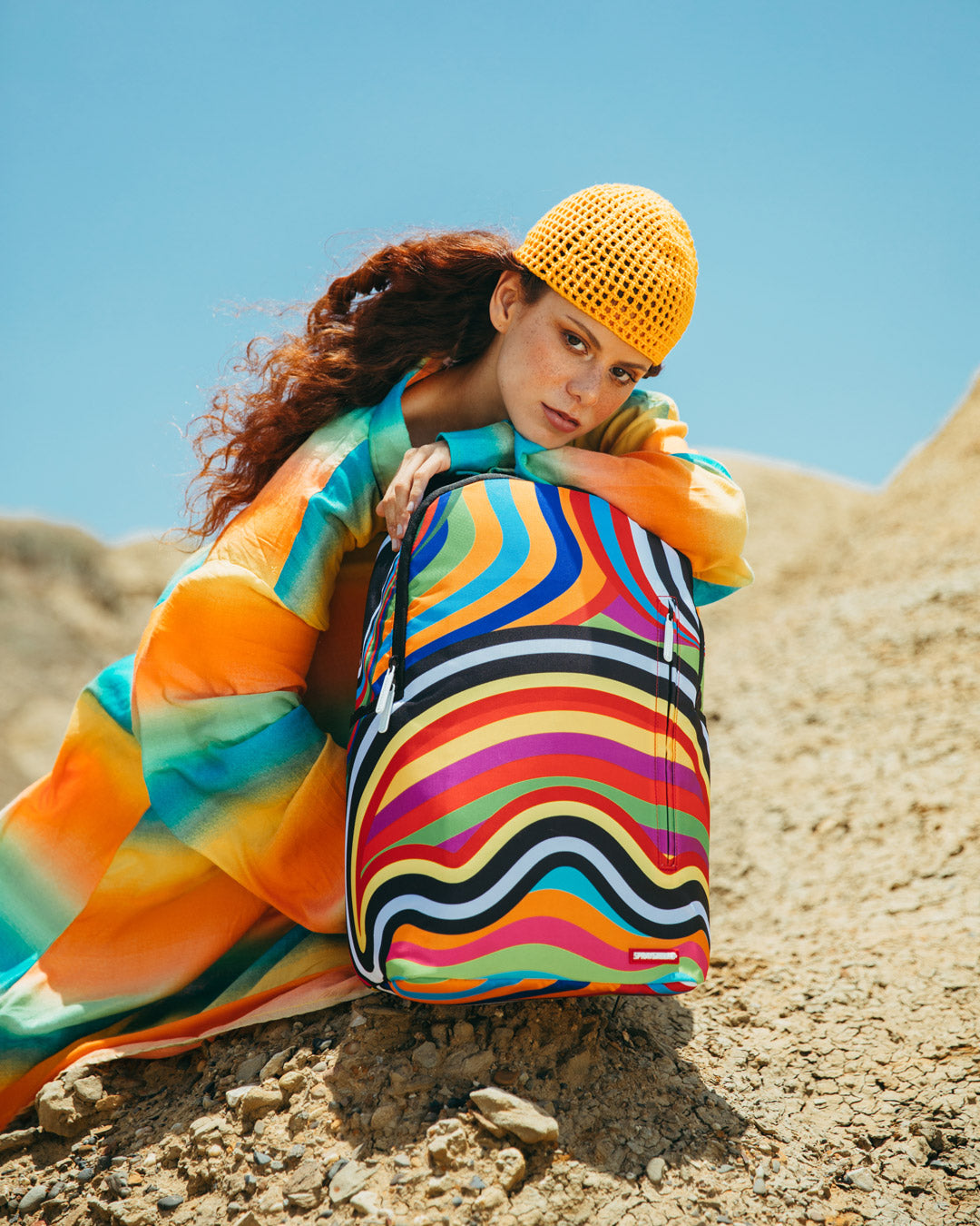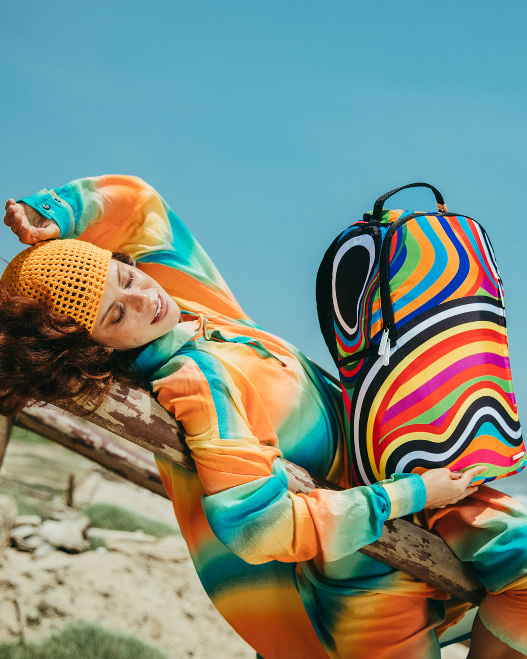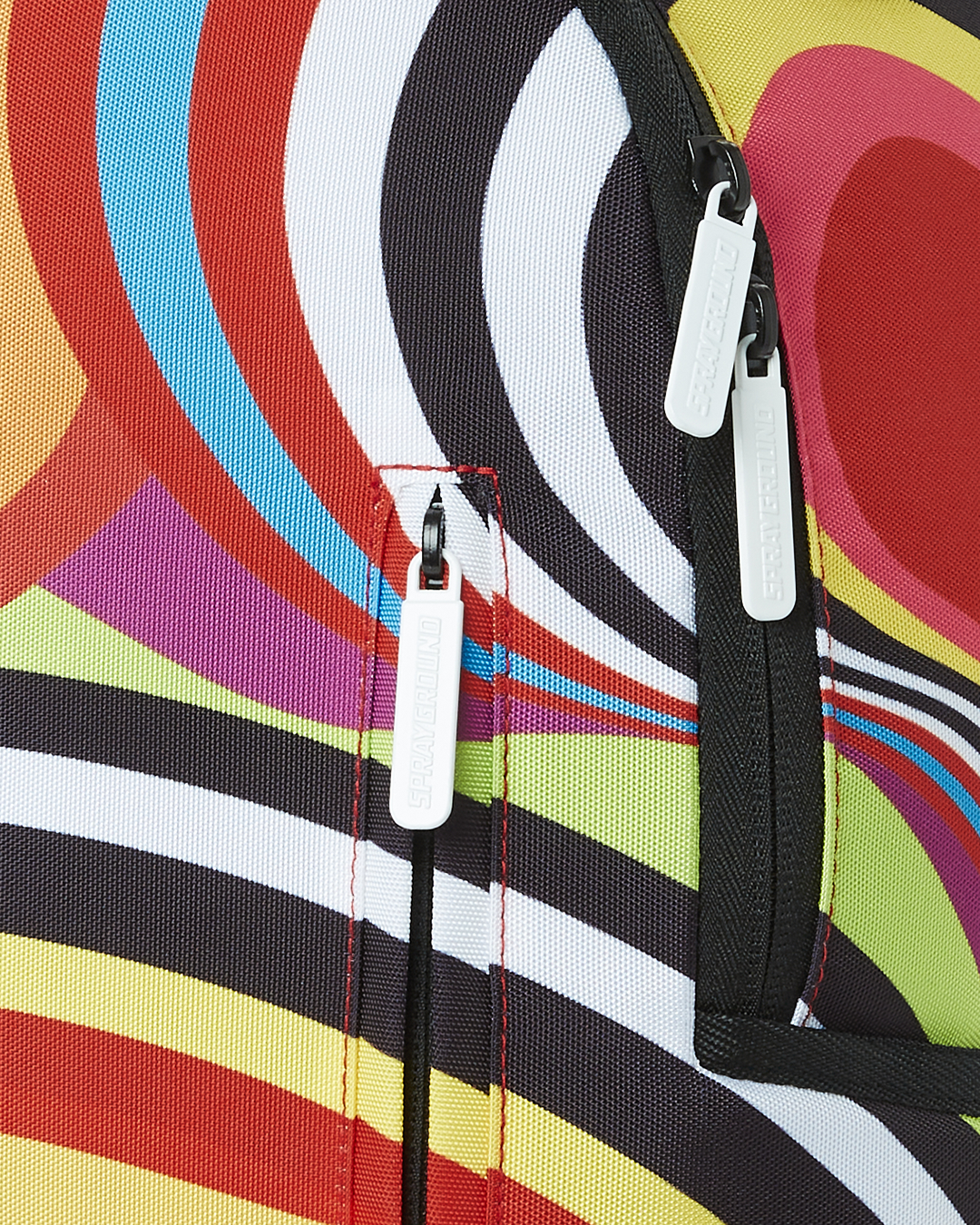 Dimensions: 18' x 6' x 11.5' • Front zipper pocket • Side pockets • Zippered Stash pocket • Separate velour sunglass compartment • Ergonomic mesh back padding • Adjustable Straps for custom sizing • Gold zippers with metal hardware • Metal 'Sprayground Authentic' badge • Slide through back sleeve connects to carry-on luggage to free your hands