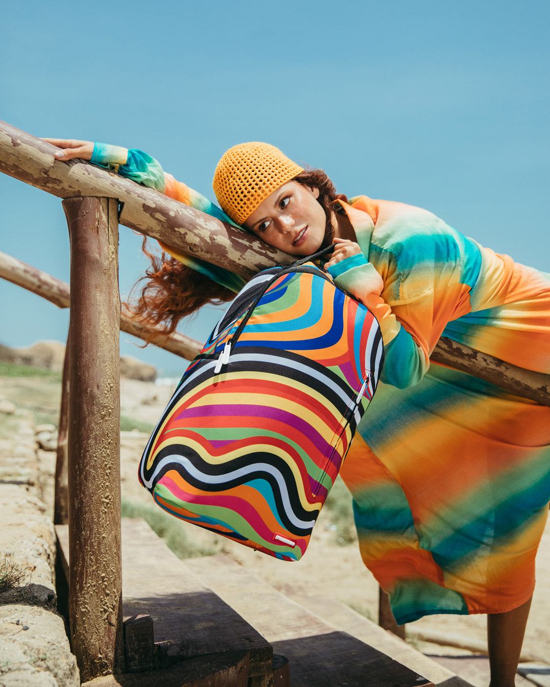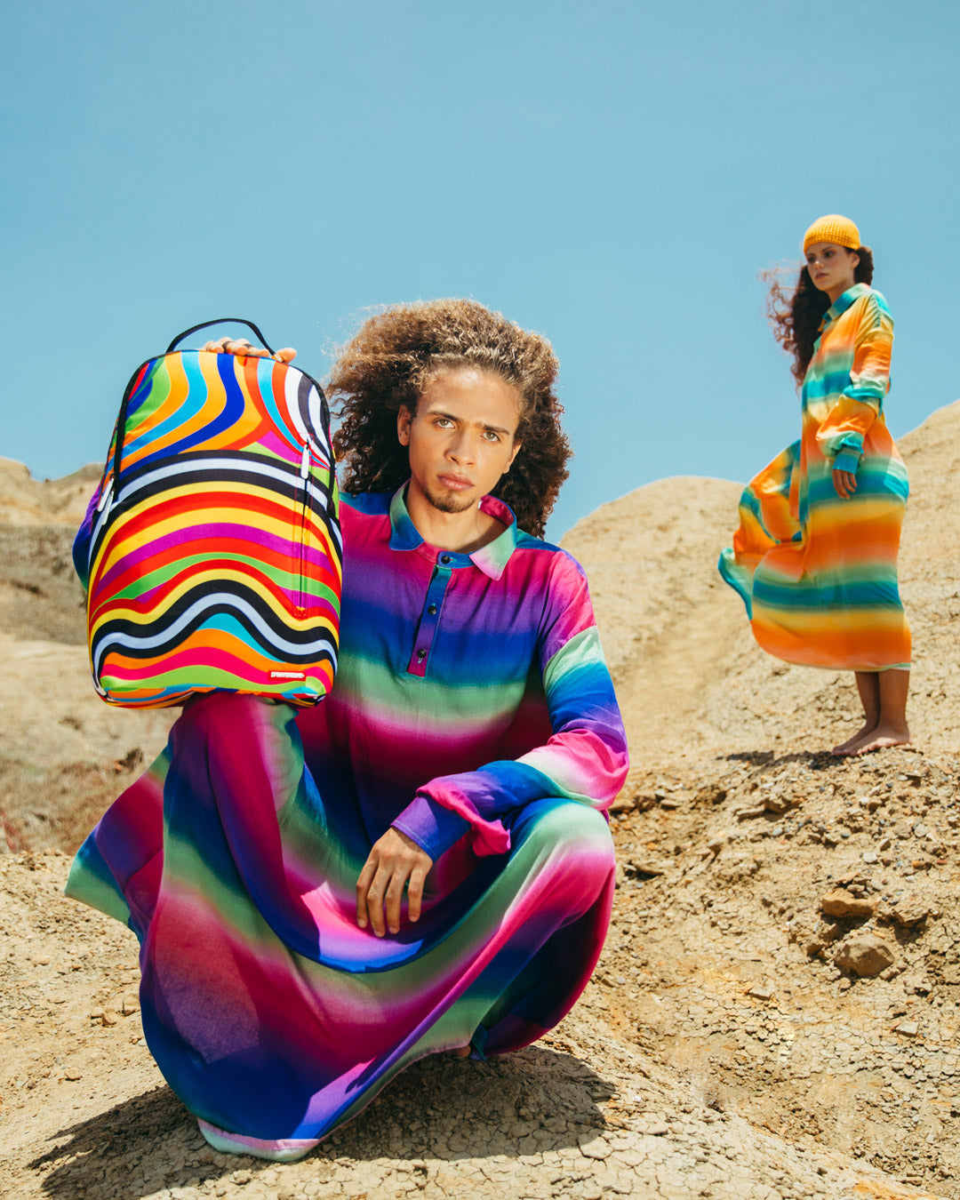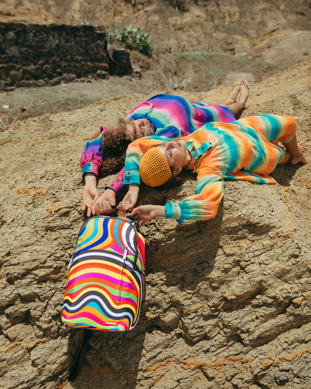 Dimensions: 18' x 6' x 11.5' • Front zipper pocket • Side pockets • Zippered Stash pocket • Separate velour sunglass compartment • Ergonomic mesh back padding • Adjustable Straps for custom sizing • Gold zippers with metal hardware • Metal 'Sprayground Authentic' badge • Slide through back sleeve connects to carry-on luggage to free your hands