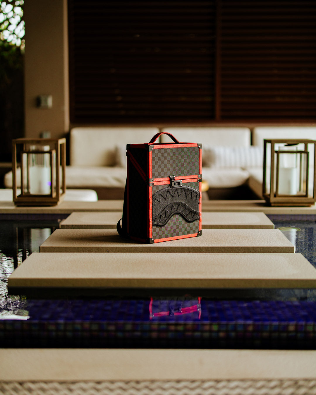 This unique Backpack is an instant classic. Drawing inspiration from a boxy shaped backpack that travelers and hikers used to use as one of the earlier designs of backpacks in the early 1900’s. Reinforcing it with a wooden frame and checkered shark pattern and luxe interior design for the modern adventurer. I call it the CHATURANGA SHARK to pay homage to the first ever board game that featured a CHESS PATTERN invented in India called Chaturanga Board Game.. Which would evolve into the CHECKERED PATTERN we all love and know in Fashion.