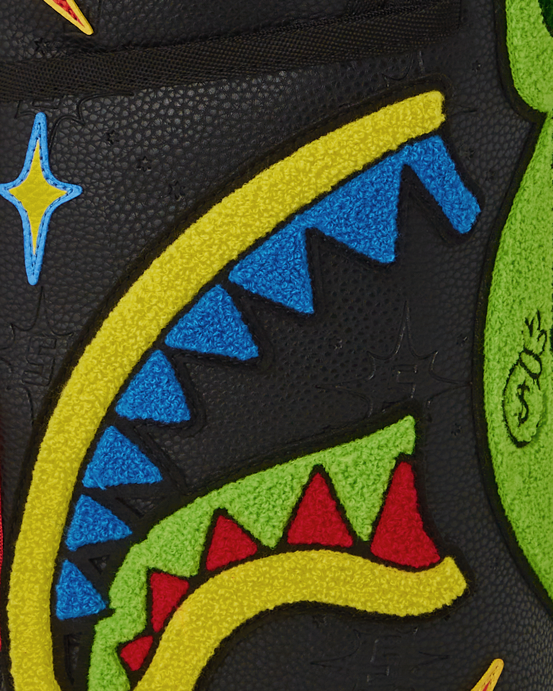 Dimensions: 18' x 6' x 11.5' • Front zipper pocket • Side pockets • Zippered Stash pocket • Separate velour sunglass compartment • Ergonomic mesh back padding • Adjustable Straps for custom sizing • Gold zippers with metal hardware • Metal 'Sprayground Authentic' badge • Slide through back sleeve connects to carry-on luggage to free your hands