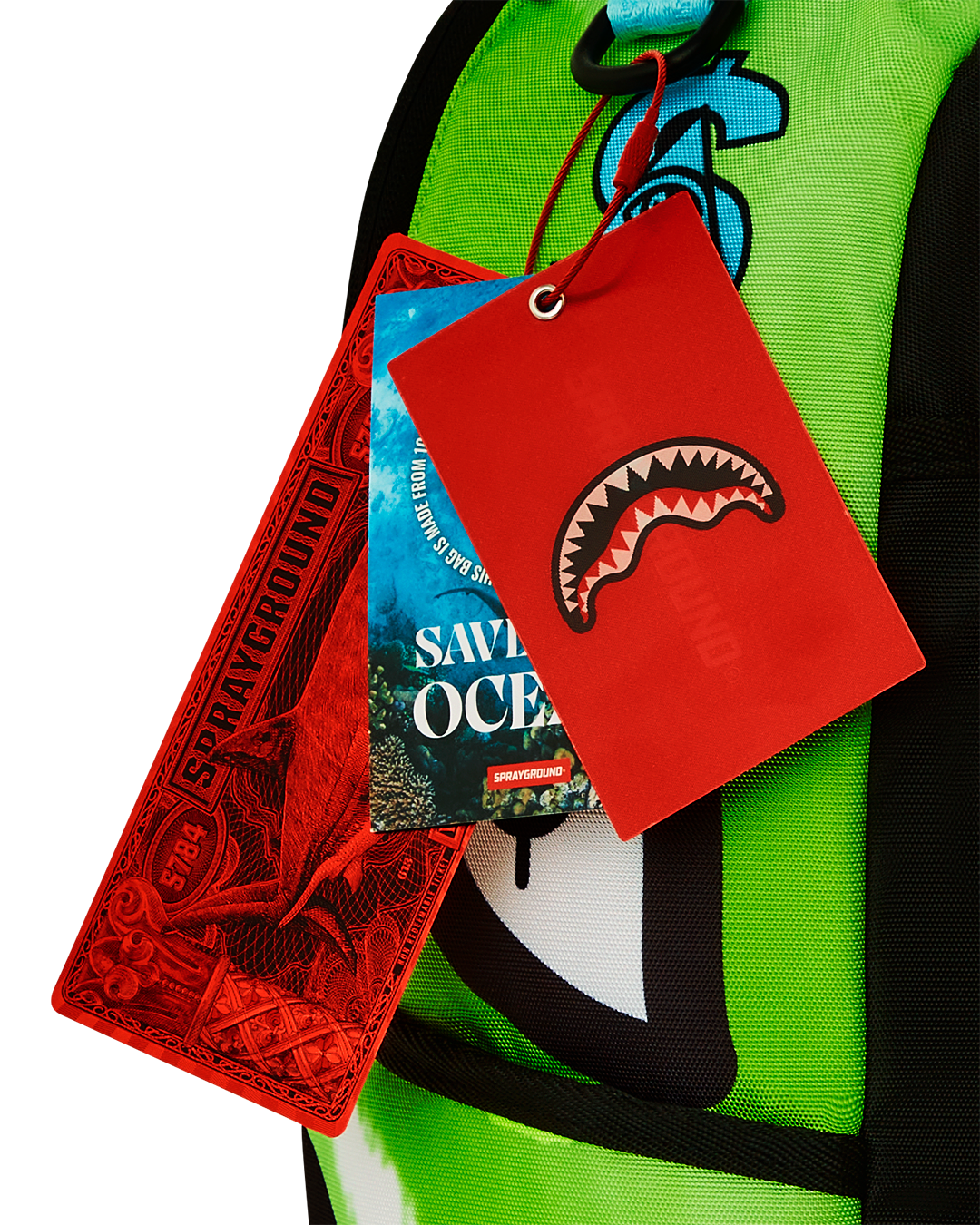 Dimensions: 18' x 6' x 11.5' • Front zipper pocket • Side pockets • Zippered Stash pocket • Separate velour sunglass compartment • Ergonomic mesh back padding • Adjustable Straps for custom sizing • Gold zippers with metal hardware • Metal 'Sprayground Authentic' badge • Slide through back sleeve connects to carry-on luggage to free your hands