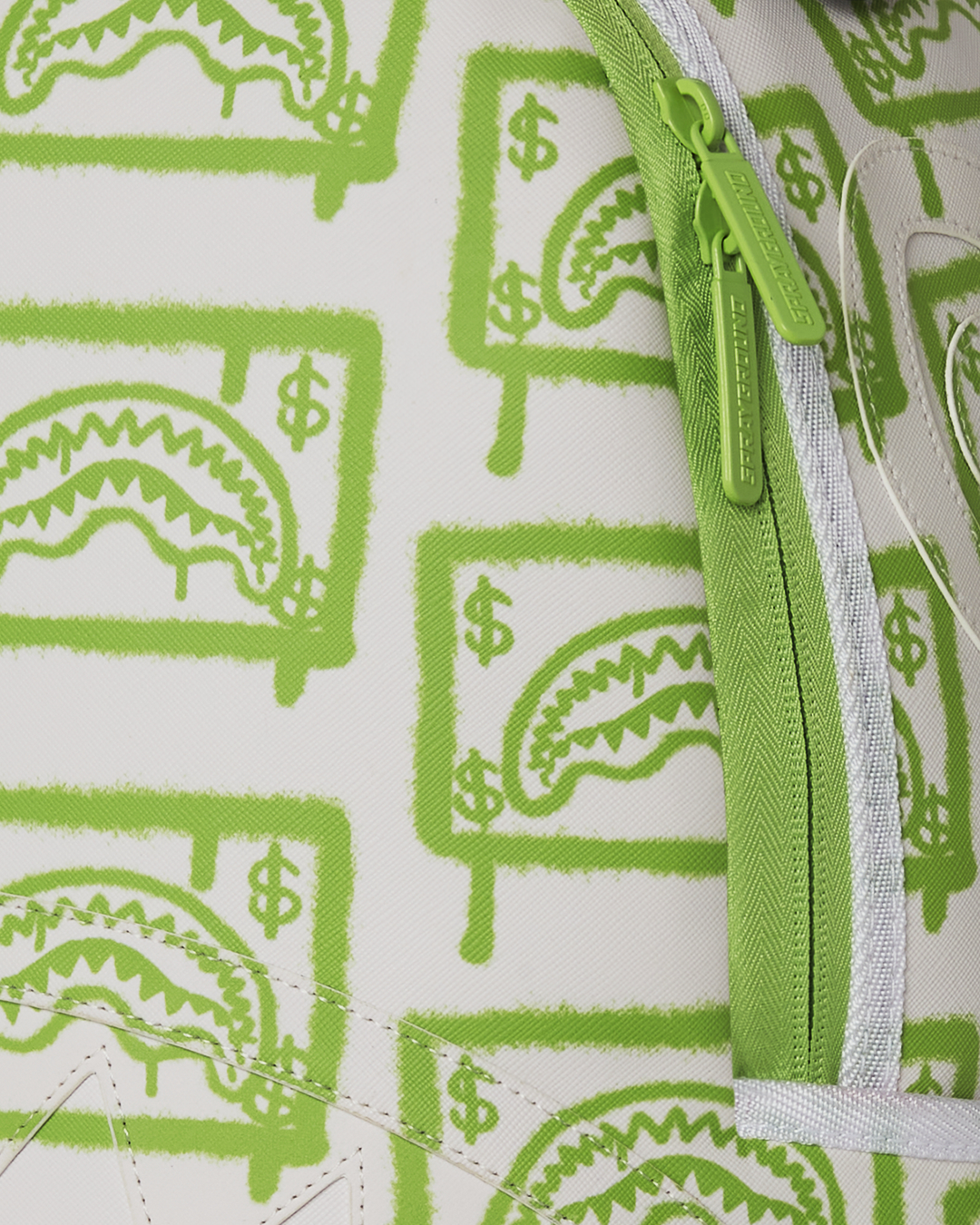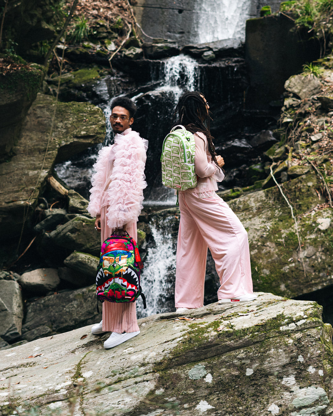 Dimensions: 18' x 6' x 11.5' • Front zipper pocket • Side pockets • Zippered Stash pocket • Separate velour sunglass compartment • Ergonomic mesh back padding • Adjustable Straps for custom sizing • Gold zippers with metal hardware • Metal 'Sprayground Authentic' badge • Slide through back sleeve connects to carry-on luggage to free your hands