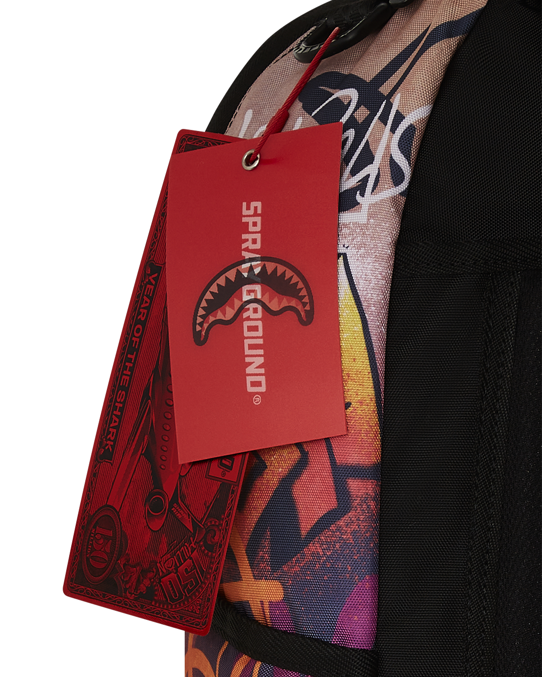 Dimensions: 18' x 6' x 11.5' • Front zipper pocket • Side pockets • Zippered Stash pocket • Separate velour sunglass compartment • Ergonomic mesh back padding • Adjustable Straps for custom sizing • Gold zippers with metal hardware • Metal 'Sprayground Authentic' badge • Slide through back sleeve connects to carry-on luggage to free your hands