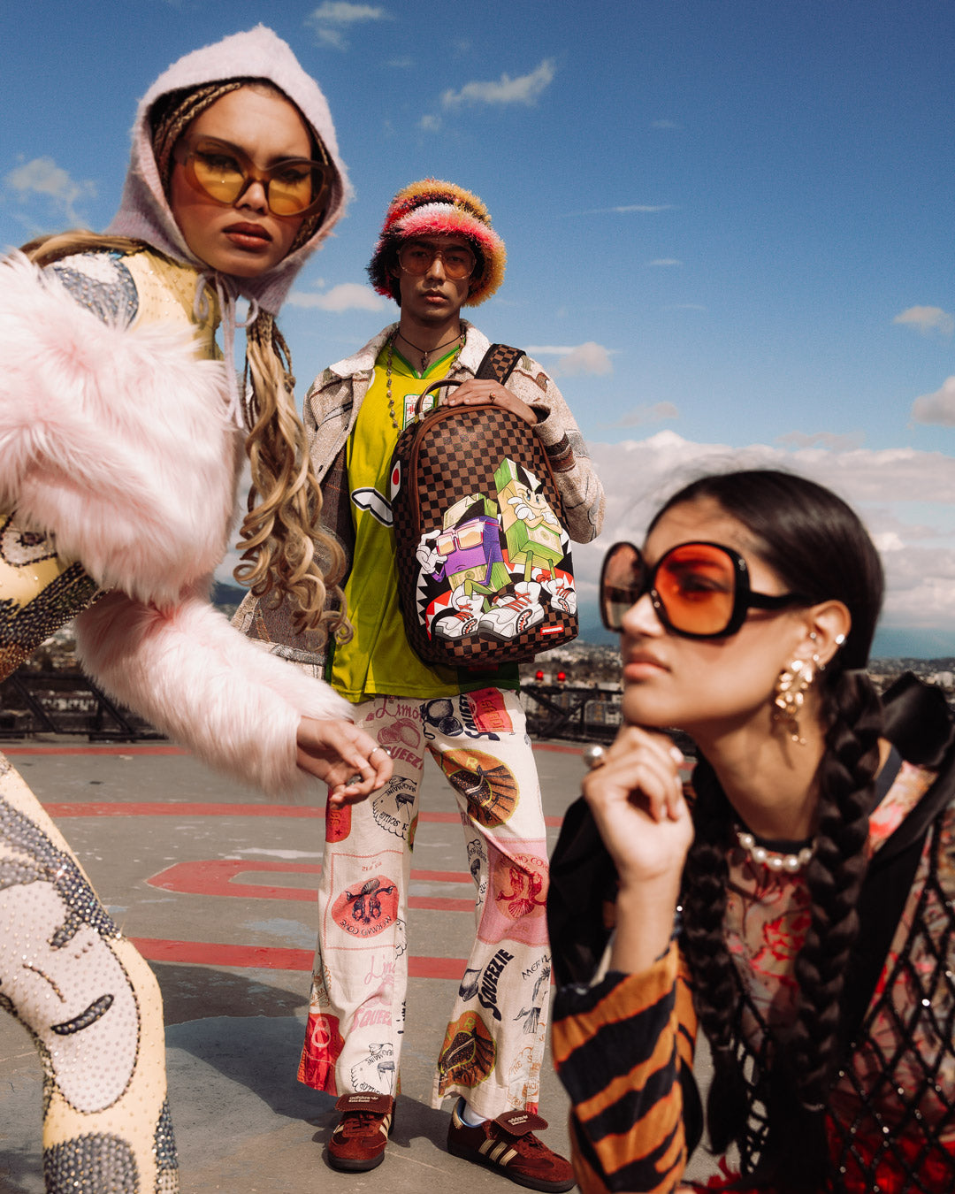 Dimensions: 18' x 6' x 11.5' • Front zipper pocket • Side pockets • Zippered Stash pocket • Separate velour sunglass compartment • Ergonomic mesh back padding • Adjustable Straps for custom sizing • Gold zippers with metal hardware • Metal 'Sprayground Authentic' badge • Slide through back sleeve connects to carry-on luggage to free your hands