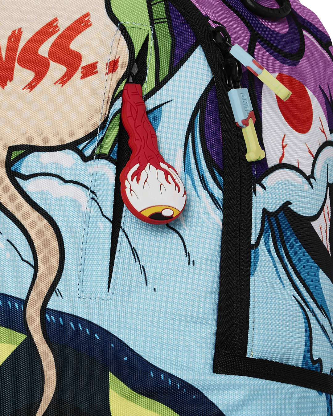 Dimensions: 18' x 6' x 11.5' • Front zipper pocket • Side pockets • Zippered Stash pocket • Separate velour sunglass compartment • Ergonomic mesh back padding • Adjustable Straps for custom sizing • Gold zippers with metal hardware • Metal 'Sprayground Authentic' badge • Slide through back sleeve connects to carry-on luggage to free your hands