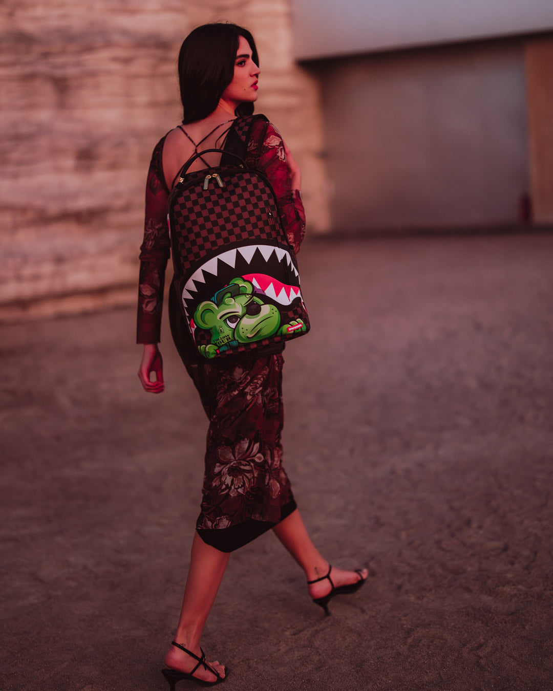 Dimensions: 18' x 6' x 11.5' • Front zipper pocket • Side pockets • Zippered Stash pocket • Separate velour sunglass compartment • Ergonomic mesh back padding • Adjustable Straps for custom sizing • Gold zippers with metal hardware • Metal 'Sprayground Authentic' badge • Slide through back sleeve connects to carry-on luggage to free your hands